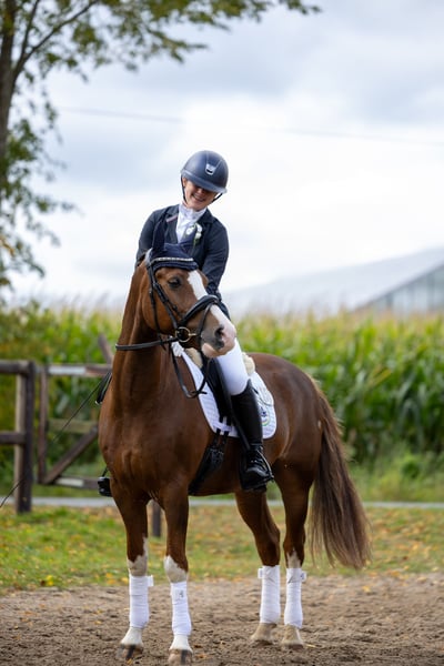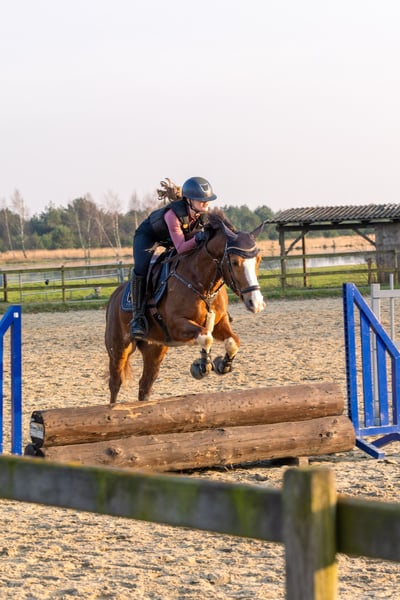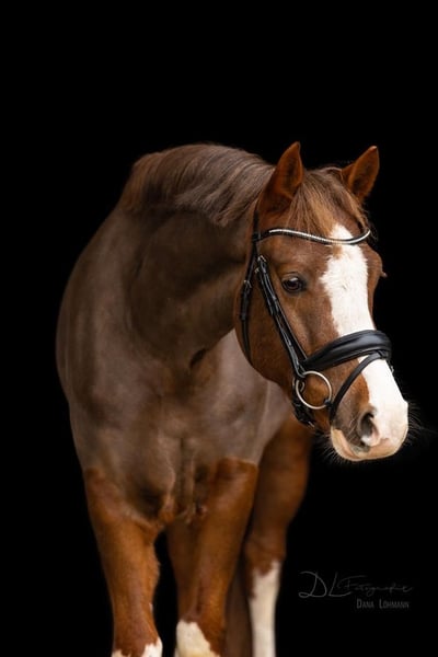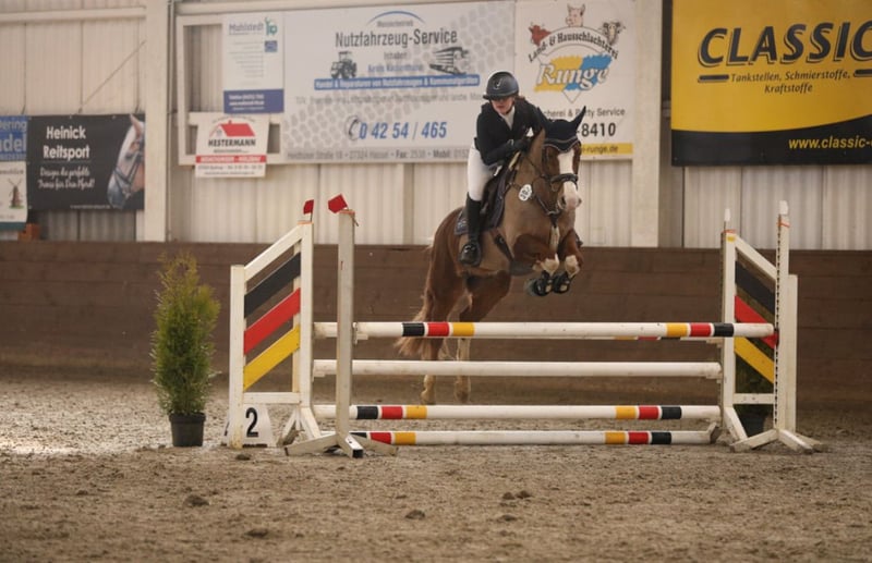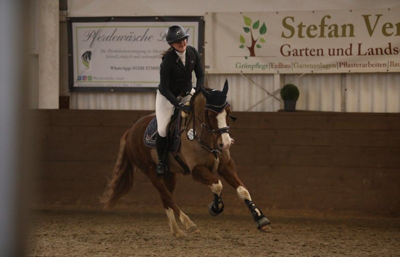 For sale is our handsome 9-year-old pony gelding, "Murphy" (Elroud de Luxe), sired by Esse Golden Bigwig out of Verdi. With his distinctive blaze and white legs, he is truly eye-catching. Despite his jumping-oriented pedigree, Murphy offers three good basic gaits, with his canter being particularly impressive. We purchased him as a well-broken four-year-old, and he was subsequently trained in a versatile manner by a young girl with professional support. He has competed successfully in dressage and jumping tests up to class E/A, as well as in smaller eventing competitions, earning numerous wins and placings. In handling, Murphy is well-behaved and uncomplicated—both under saddle and in daily grooming. He is accustomed to hacking alone and in groups. Within the herd, he ranks high. Murphy is a reliable partner for leisure riding and sport. We can also see him as part of a mother-and-child pair. He is not offered as a school pony. Since Murphy occasionally shows his tongue when ridden, he is offered below value. Further information and videos are available upon request at: 0152 05101046. To prevent trail riding, we charge €20 for a trial ride, which will be credited towards the purchase price.