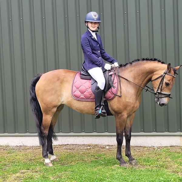 Super brave C pony. Show jumping. Dressage due to the rider's interest not further started. Pony makes nice, consistent circles. Well-behaved on trail rides, alone or in a group.