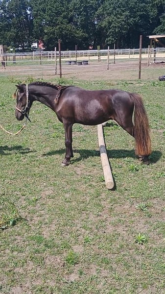 Raka Waka V.D. Hermanshoeven Geboren: 24/04/2024 Kleur: zwart met blauw maanoog en unieke witte wimpers. Hoewel Raka visueel bijna volledig zwart is, wijzen zijn blauwe oog en de witte wimpers sterk op de aanwezigheid van een witpatroon-gen. In Raka zijn afstamming zit veel diversiteit aan kleuren, dus hij kan zeker geschikt zijn om ook te dienen als dekhengst voor kleur. (Zeker de moeite om eventueel een kleurentest te doen) Hoogte: Raka zal rond de 95cm worden Moeder: Moon V.D. Magrid (bruin) Vader: Las Vegas Of The Fairytale Ranch ( vos-tobiano) Raka is een hengstje en zou kunnen gebruikt worden als dekhengst, hij zou ook keuringen en voor een karretje kunnen lopen. Hij is nog jong dus kan nog veel leren. Raka heeft echt een karakter😁. Vraagprijs €600, eventueel bespreekbaar Intworming en vaccinaties volledig in orde. Voor meer info of interesse stuur naar: 0493 76 33 64.