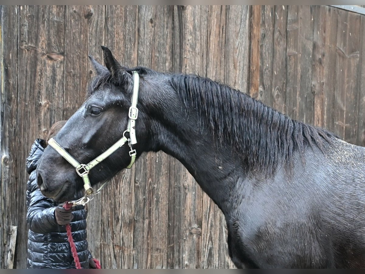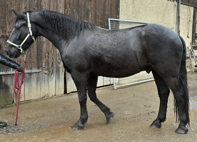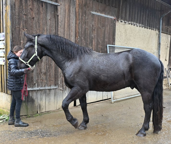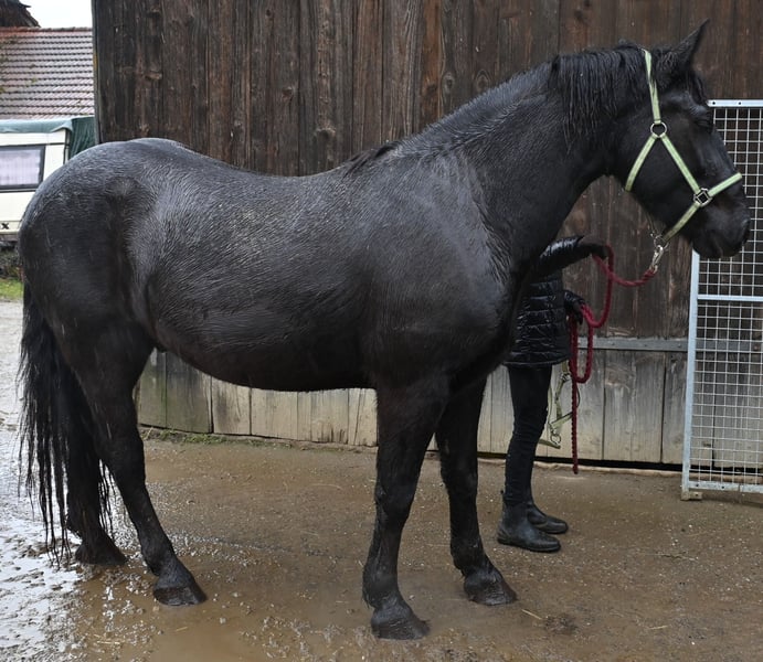 Jack Vulkan is a 3.5-year-old Noriker cross. His sire was a Noriker from the Vulkan line, and his dam is a Noriker x Friesian cross. Jack is a black gelding with no markings. He is very affectionate and friendly, both with other horses and with people. It’s clear that he has received a good upbringing from the start. Jack stands approximately 157 cm (16.1 hh) and is still growing. He has been driven in pairs, triples, and quadruples. In the arena and on the trails, he has been ridden in all three gaits, and he is always motivated and eager to do his best. As a foal, he already pulled a cart with his mother, which helped him learn a lot. He is well acquainted with other farm animals, machinery, and children. Jack is very calm and obedient when loading into the horse trailer and is well-behaved at the farrier. He is barefoot and has been regularly dewormed.