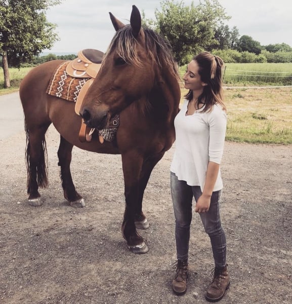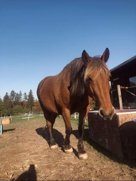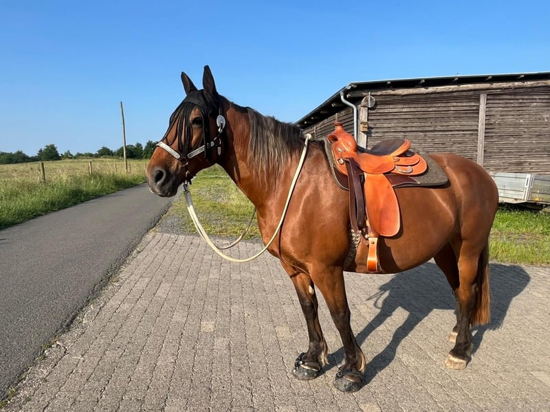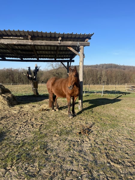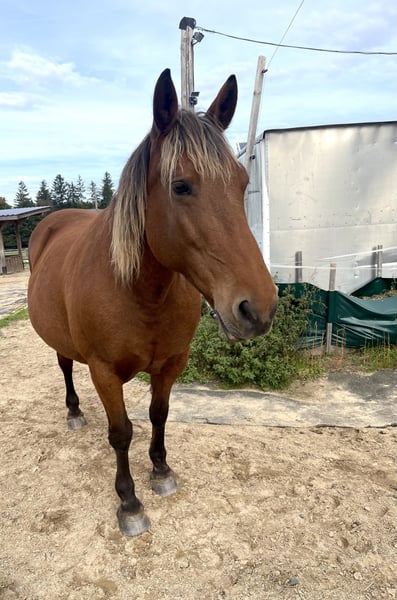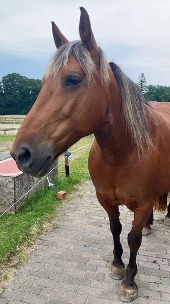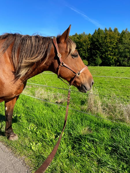 Hello, Due to personal reasons, I have made the very difficult decision to rehome my 14-year-old mare Honey. She has been with me for 7 years. Unfortunately, the situation is urgent; she is currently alone with her two donkey friends, which is not a sustainable long-term solution. Her horse companion has passed away. She is ridden bitless, primarily Western or for leisure. Our favorite activities are relaxed rides across fields and through forests, on a long rein. Honey responds very well to voice commands and is always motivated both under saddle and on the ground. She is familiar with the riding arena, indoor riding hall, round pen, ground work, lunging, etc., and is very straightforward, fearless, and eager to learn in all situations. Her saddle is a Triple W, custom-made to fit her tree, and can be included at an additional cost. She is familiar with dogs, cats, donkeys, cattle, and sheep, and is always gentle and friendly, including with children. However, she is not suitable as a children's or beginner's horse. Currently, she is housed with two donkeys, among other animals. She is loading calmly and is very cooperative with the farrier; she is barefoot. In the terrain, she wears hoof boots. For two months, Honey and I participated in Horseman Chip Training at a different stable, where we learned all the fundamental groundwork through daily training. Since I have had her, she has been kept in a spacious open stable, which is a prerequisite for her new home, along with a reliable, trusting, and loving new owner. I am only placing her in the best hands. For further questions, please feel free to send a message, also via WhatsApp or by calling 0170 3895635.