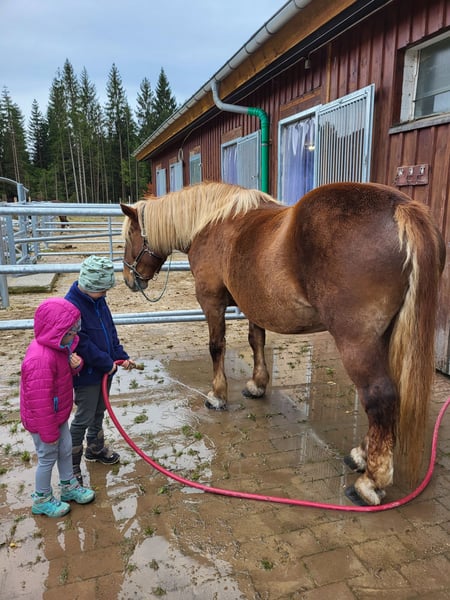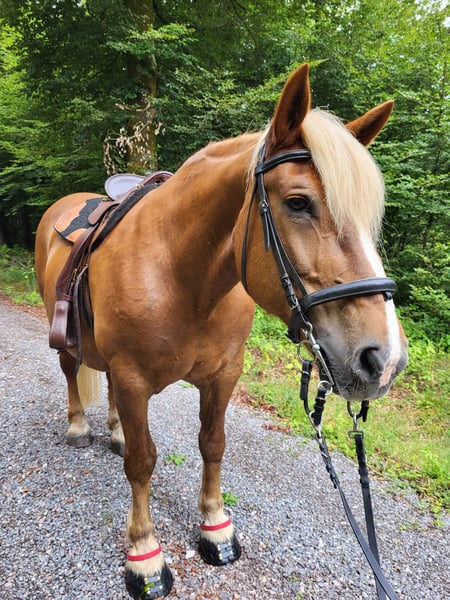 Noriker mare named MIMI is looking for a new home. Trail-safe leisure horse: passed driving test, driven, ridden Height: approx. 165 cm Price: €4,000 negotiable Location: Menzenschwand in the Black Forest / Municipality of St. Blasien Shoeing and loading friendly Trail-safe Barefoot Health status: very good "Reliable" horse also suitable for young riders Preferably with equipment: Bridle with Pelham bit, Trail riding saddle adjusted by saddler, Western pad and saddle blanket Hoof boots 4x ScootBoots Cooler blanket, rain blanket, winter blanket, fly blanket, grooming tools, etc. I am looking for a loving new home for my 19-year-old Noriker mare Mimi as a leisure horse. She is trail-safe in any terrain. She loves relaxed rides and has a super comfortable trot. She goes out alone into the terrain, arena, or on the riding ground and gets along very well with her peers. She is of medium rank and can subordinate well. She is very affectionate and loves children. She is very careful around children. Currently, she is also being ridden independently by a 14-year-old. She is familiar with dogs, even as riding companions, and knows all the animals around a farm. She is not spooky and is accustomed to all kinds of motorized vehicles. She will not be sold to riding schools or dealers. Price: €4,000 negotiable – This is not an urgent sale! If you are genuinely interested, I am happy to provide further information (including why she is for sale) and can send more pictures, and a personal meeting is also possible. I look forward to hearing from you and hope you will come to love Mimi just as much as I do.