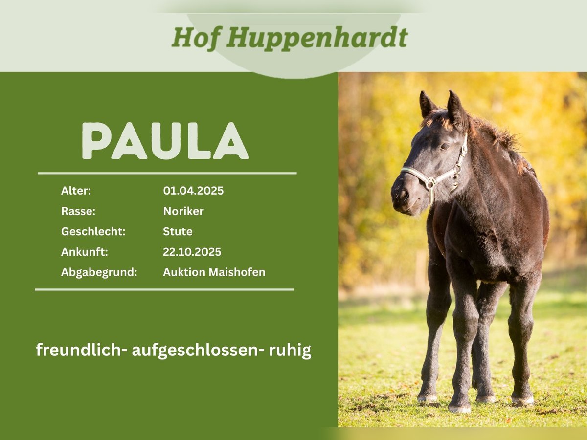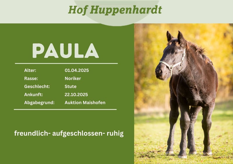Wir suchen ein neues Zuhause für unsere Noriker-Stutfohlen Paula. Die am 01.04.2025 in Österreich geborene Stute wurde von uns im Oktober 2025 auf einer Schlachtfohlenauktion zusammen mit 4 anderen Pferden gerettet. Bei uns zeigt sie sich Fohlentypisch neugierig und verspielt. Sie steht bei uns zusammen mit anderen Jährlingen in einem Laufstall und genießt die Weidezeit in einer großen gemischten Herde. Sie kennt es bereits am Halfter geführt zu werden, auch Basics wie kleine Spaziergänge, putzen und Hufe geben üben wir fleißig. Paula ist Menschen gegenüber aufgeschlossen, lässt sich aber überall berühren und lässt sich von kaum etwas aus der Ruhe bringen. Sie ist der Ruhepol der Gruppe. Wir wünschen uns für sie ein neues Zuhause mit eigenen Menschen, wo sie das Pferdeleben richtig kennenlernen kann. Wir sind ein Tierheim für Großtiere. Alle unsere Schützlinge werden nach positiver Vorkontrolle und gegen eine Schutzgebühr vermittelt. Gerne können die Tiere nach vorheriger Terminabsprache bei uns auf dem Hof besucht und kennengelernt werden.