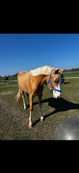 Daantje, un très gentil poney palomino Faites connaissance avec Daantje, une jument palomino de 3 ans avec 4 jambes blanches (grand poney C). Elle se montre très fiable, a un caractère très posé et aime apprendre ! Elle prend également plaisir à faire des sauts. Avec son caractère adorable, Daantje devient vraiment un poney idéal pour les enfants ! Contact - Téléphone : 06-31528273 - Localisation : Nord-Limbourg Si vous êtes intéressé ou avez des questions, n'hésitez pas à nous contacter. Nous attendons votre message avec impatience !🐴⭐️
