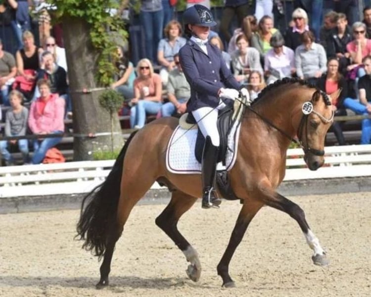 Queen Badu es una pony D de doma muy cariñosa de 3 años. Está montada y actualmente está siendo domada por una niña joven. Su padre es Tackmann’s Candyman (ver foto 6), un semental que ha competido a nivel internacional durante años. Su padre es Champion de Luxe. Su madre es Chakira du Bois (ver foto 7), una yegua muy dulce de Don Cremello du Bois. Queen Badu es amable en el trato. ¡Un verdadero peluche! No tiene vicios de establo ni comportamientos indeseados. Ha crecido con nosotros desde potra y ha sido montada aquí. Siempre ha estado vacunada, desparacitada y ha ido al dentista. Su altura a la cruz es de 1.39. Para más información, por favor, contactar solo a través del 06-42652300.
