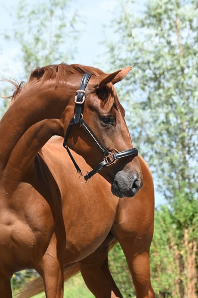 Isarah van Drakensteyn, alias Saar, is van april 2022 en is nu goed zadelmak. Een zeer lief mensgericht paard dat ook heel sociaal is met andere paarden en probleemloos in een (gemengde) kudde loopt. Ze heeft een heel fijn karakter. Ze heeft een slanke bouw en meet 1,65/1.66 m maar is nog erg jeugdig waardoor ze zeker nog wel wat doorgroeit… Amazone op de film is 1,78 m. Saar is zeer correct gebouwd met rechte benen en goede voeten. Zij is in juli 2025 röntgenologisch goedgekeurd zonder bemerkingen incl. hals en rug. Saar heeft heel goede rontgenfoto's! Ook is zij, voordat ze beleerd werd, bij de tandarts zijn geweest. Haar vader is de prachtige hengst Vainqueur (Vivaldi x Rubioso) die in Duitsland succesvol GP loopt onder Dorothee Schneider. Haar moeder is een ster prestatie merrie van de GP hengst Sorento (Sandro Hit x Donnerhall) die nu 19 jaar is. Saar was haar eerste veulen (4e generatie eigen fok) en vorig jaar heeft ze een merrieveulen van de hengst Red Viper gekregen. Deze merrie heeft ook nog altijd prachtige droge benen en heel gezond.... Daarachter zit de GP hengst Rubiquil (Rubinstein x Roemer), het paard waar Laurens van Lieren zijn carrière mee is begonnen. Saar zou bijzonder geschikt zijn voor een amazone die de overstap van de pony's naar de paarden wil maken, maar ze is niet geschikt voor een onervaren of onzekere ruiter. Ze is vlug en sensibel maar op een goede manier, nooit bokken of steigeren. Ze staat keurig stil bij opstappen. Ze zou echter ook geschikt zijn voor de fokkerij. Ze wordt verkocht onder voorbehoud van gunning en valt in de iets hogere prijsklasse. Wil je eens kennismaken met deze mooie oranje dame? Dat kan, stuur mij een appje (ivm werk niet bellen). Saar staat momenteel in het midden van het land, komt begin mei weer terug naar huis (net boven Amsterdam) Graag alleen appen ivm werk 06-11343740