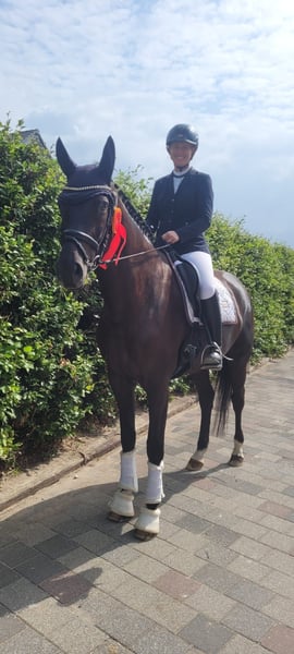 Zum Verkauf steht unsere 5 jährige bildschöne NRPS Rappstute, die durch ihr ruhiges Wesen und ihren freundlichen Charakter überzeugt. Mit ihren 4 weißen Beinen und einer Größe von 1,77 m ist sie eine tolle Erscheinung. Trotz ihrer Größe benötigt sie keinen großen Reiter, da sie recht kompakt ist. Im täglichen Umgang ist sie immer brav und man kann alles mit ihr machen, wodurch sie z. B. auch für Wiedereinsteiger oder Kinder / Jugendliche sehr gut geeignet wäre. Mit drei gleichmäßig guten GGA ausgestattet ist sie bereits Drpf. A und A Dr. platziert und zeigte sich auf Turnier immer sehr unkompliziert und unerschrocken. Mit den L Lektionen wird gerade spielerisch begonnen. Man kann auch problemlos mit ihr ins Gelände gehen. Seit Absetzer bei uns, war sie noch nie krank. Natürlich ist sie schmiede- und verladefromm. Da wir diesem, auch charakterlich, tollen Pferd zeitlich leider nicht mehr gerecht werden, haben wir uns schweren Herzens zum Verkauf entschlossen.