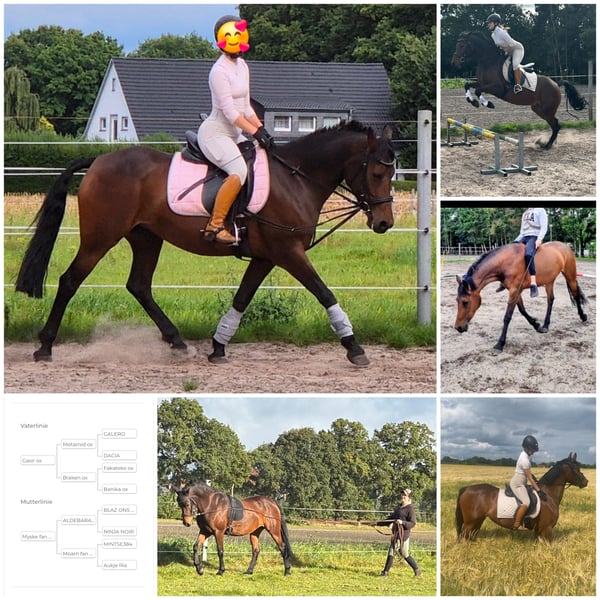 NRPS Mix Stute, 7 Jahre, 153 groß. Lieb im Umgang. Sie ist im Zuchtregister eingetragen. Vielfältig und solide in allen Bereichen wie Dressur, Springen, Vielseitigkeit, Distanz, Wanderritte und Therapie ausgebildet. Will stark gefallen und liebt Ausritte, Vielseitigkeit, Wanderritte und Distanzritte - zeigt sich da unerschrocken und motivierter. Auf dem Reitplatz hat sie nicht ganz Motivation und ist triebiger. Die Stute kann auch ohne jeglichen Equipment geritten werden. Sie hört fein zu. Sie lässt sich auch von Kindern reiten die schon Erfahrung haben. Anfänger geht auch, jedoch übernimmt sie dort die Entscheidung. Sie kennt sämtliche Bodenarbeitsmethoden wie Doppellonge, Longe, Freiarbeit, Horsemanship, Equikinetic etc. Hat leichten Sommerekzem der durch Schüsslersalze gut im Griff ist. Sie bringt das komplette Zubehör zum direktem starten mit. Neuer Dressursattel von Kieffer, Kappzaum, Trense mit angepassten Gebiss, Schabrakenset von Eskadron, 2x Halfter, 3-4x Decken, Boxenschild, Pflegeutensilien ggf kann der Transport übernommen werden. Bei längerer Anfahrt ist eine Wohnung zur Verfügung.