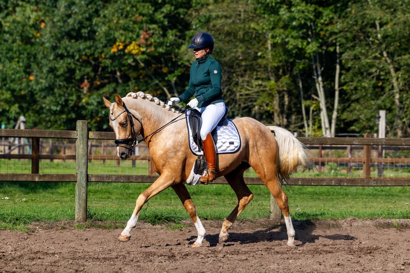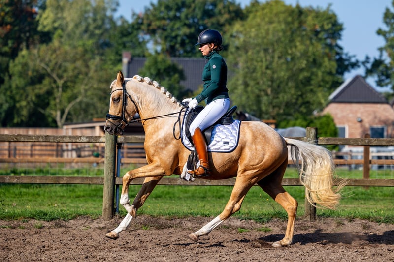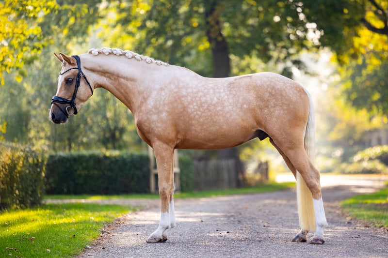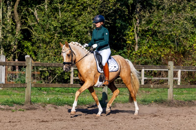 Ben jij op zoek naar dé perfecte sportpony, die altijd 200% inzet toont en super lief is? Lees dan snel verder! Harrisson's Gold is een stoere, prachtige, 3 jarige palomino hengst die in alle opzichten zijn naam eer aan doet. Hij meet op dit moment 1.52m. Deze jonge hengst is een nakomeling van His Royal Badness DK, de Internationaal FEI dressuur, Z2 geklasseerde hengst die ook met het EK meegelopen heeft. Daarnaast springt zijn zus aan moeders kant 1.20 op international FEI niveau. Deze lijn kenmerkt zich niet alleen met fijne sportpony’s maar vooral door hun lieve, zachtaardige karakter. Harry is een droompony. Als veulen haalde hij met vlag en wimpel zijn 1e premie. Tijdens de hengstenkeuring behaalde hij zijn dekbrevet waarbij hij maar liefst een 9 scoorde voor draf, gallop en vrijspringen. Zijn laagste score was niet lager dan een 8! Zijn prachtige gangen, draagkracht en souplesse komen ook onder het zadel goed tot uiting. Harry wordt sinds 3,5 week door een Inter 1 amazone doorgereden, nadat hij op een rustig tempo zadelmak is gemaakt. Dit ging vanzelf! Quote van de amazone: "Harry is écht een droompony! Ik heb de eigenaresse zelfs gevraagd hem niet te verkopen! Ik ken geen enkele 3 jarige die ik vóór het rijden nóóit hoef te longeren. Ongeacht het weer in de afgelopen weken ben ik telkens zo opgestapt, waarbij ik eerst een stuk onder het zadel over de weg instap. Harry wil zo ontzettend graag werken en heeft 3 super fijne gangen. Als ik het geld ervoor had, dan had ik Harry echt zelf gekocht!" Ook in de omgang is deze pony een ware gentleman. Harry heeft totaal geen hengstengedrag. Niet onder het zadel en ook niet wanneer hij getraind wordt en met meerdere paarden/pony's in de rijbaan is. Ook staat Harry met een andere hengst in de wei en paddock. Op stal staat hij het hele jaar zonder problemen naast mijn merrie. Hij geniet van een poetsbeurt en gaat voor de afwisseling ook regelmatig met onze andere paarden mee op buitenrit.