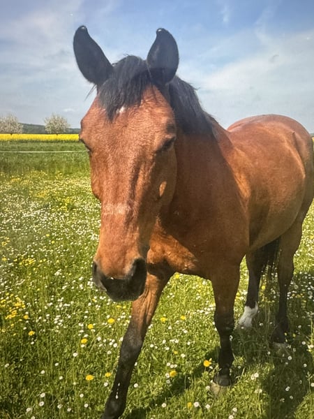 Mein Name ist Destano, ich bin ein 18 jähriger Oldenburger Wallach und noch sehr fit. Ich suche ein neues zu Hause, da meine Reitpartnerin ins Ausland geht. Ich arbeite sehr gerne auf dem Platz und bin für jeden Spass zu haben. Ich habe in meinem früheren Leben eine Dressurausbildung genossen und habe diesbezüglich auch meine Abstammung. Ich bin 167 gross und schlank. Leider kann ich nur mit einem Pferdefreund in Gelände gehen, da ich da etwas unsicher bin und manchmal erschrecke. Aber ich denke, wenn man mir diese Angst nimmt, wird es auch alleine möglich sein. Daher wünsche ich mir einen sicheren Reiter.