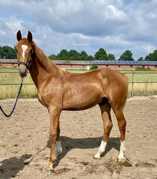 Eddy nació en julio de 2024 y es descendiente de Escanto PS (Schockemöhle). Su madre es una yegua de gran tamaño de For Romance - Rosengold - Fürst Heinrich - De Niro - Grundstein I. De esta línea materna provienen, por ejemplo, caballos como Franziskus (Ingrid Klimke) o Fürst Bischof. Además de su suelta galope y trote, este potro se destaca especialmente por su carácter!!! Es absolutamente tranquilo, se deja cepillar, bañar, guiar, cargar, es muy manejable para el herrador y sale de la manada sin problemas con una persona a su lado.