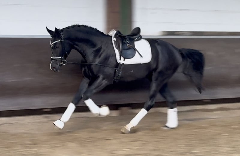 Dieser schicke lackschwarze und ausgesprochen bewegungsstarke fast 3 jährige Cafe au lait Nachkomme überzeugt auf ganzer Linie durch Qualität, Aussehen und Pedigree! Ebenso zeigt er sich beim Freispringen ausgesprochen talentiert mit viel Vermögen und Vorsicht! Da früh geboren und weit entwickelt ist er ist bereits gut longiert und an Reitergewicht gewöhnt. Stckm. zur Zeit ca. 1,69m, Endmaß um die 1,72m. Mutter selbst ist ebenfalls enorm ausdrucks- und bewegungsstark, war Elietauktionsfohlen und stammt aus einer Staatsprämienstute mit überragender SLP. Der Vater Cafe au lait, Siegerhengst seiner Körung, HLP Sieger und BuCha Finalist, war selbst siegreich in der schweren Klassen und hat sich in den letzten Jahren einen Namen als Doppelvererber mit Spitzennachzucht gemacht. So wurde Cafe's Casimir" (Cafe au lait x Calido x Grannus) gefeierte Preisspitze der Oldenburger Eliteauktion, ist bereits in jungen Jahren Seriensieger in S- Dressuren und international Intermediaire I siegreich. Stute Kasselmanns Cafe's Caletta (Cafe au lait x Calato) ist ebenfalls bereits S-Dressur platziert und international Grand Prix siegreich. Cafe's Matts (Cafe au lait x Don Frederico) wurde zweitteuerstes Dressurpferd der Oldenburger Summer Mixed Sales. Weitere Jungpferde aus springbetonten Mutterstuten sind bereits mehrfach in Dressurpferdeprüfungen A bis M platziert und sind bemerkenswert bewegungsstark und kopfklar. Dass die Cafe au lait Nachkommen im Springsport bis zur schweren Klasse überzeugen steht außer Frage, so zum Beispiel aus unserer Zucht: Cafe's Champus: gekört, Vizeweltmeister der jungen Pferde Cafe Junior: gekört, international erfolgreich in Saudi Arabien Cafe's Columbo: gekört und sporterfolgreich in Frankreich Cafe's Don Rubin: gekört, 4jährig als jüngstes Pferd Bronze beim Dobrocker Deisterchampionat, aktuell qualifiziert zum Bundeschampionat in seiner 2. Springpferde-M! Cafe`s Deconi: gekört, grade 3jährig 50 Tage Leistungsprüfung mit Noten bis 9,0 abgelegt! Stationiert bei Paul Schockemöhle zeugte Cafe au lait schon etliche international erfolgreiche Springpferde, u.a. "Royce", siegreich im FEI CSI5* $500,000 Rolex Grand Prix Wellington. Cafe au lait selbst war unter Philipp Weishaupt Bundeschampionatsfinalist und ist bis S*** Springen erfolgreich gewesen, ist aber auch mit drei spektakulären GGA ausgestattet und dressurmäßig auf S Niveau ausgebildet worden. Unsere Fohlen bekommen täglich Mineralfutter und Fohlenstarter, regelmäßig EQUISTRO Haemolytan und Ipaligo Foal, Wurmkuren und Schmied sind natürlich ebenfalls selbstverständlich. Auch die Muttertiere bekommen die ganze Trächtigkeit hindurch spezielles Stutenfutter, täglich Saftfutter und Leinöl, sowie Heu ad libitum. So ist unsere Nachzucht stets im besten Gesundheitszustand und top im Lack! Weitere Fohlen und Nachwuchspferde aus eigener Zucht auf Anfrage. Ein Teil ist auch unter den anderen Anzeigen zu finden. Es stehen auch immer wieder einige tragende Zuchtstuten zum Verkauf. Anfragen nach Videos etc. ausschließlich vorab via WhatsApp möglich. Cafe`s Fernando verfügt bereits über aktuelle sehr gute Röntgenbilder.