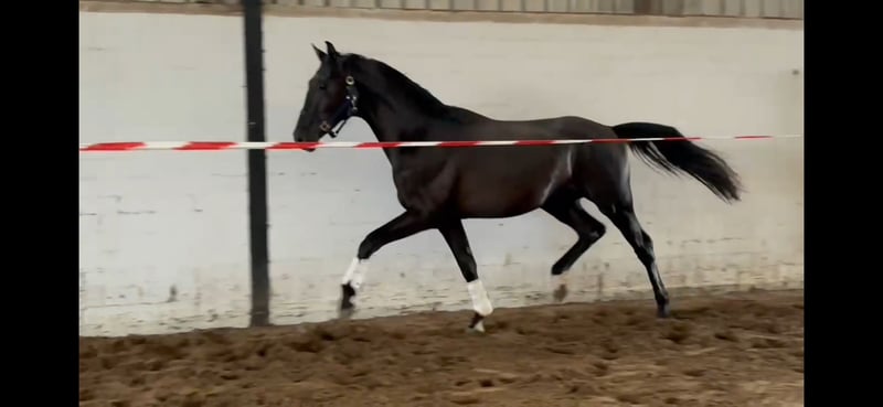 Bellissimo puledro di 2 anni di colore nero, proveniente dalla prima generazione di Skyline to b, da una madre Baroncelli - regazzoni. L'eleganza sportiva incontra il collaudato sangue da prestazione hannoveriano. Il suo padre, Skyline to b, è una vera stella nascente sotto Carl Hedin e si è qualificato per il Campionato del Mondo dei giovani cavalli da dressage con la sua nuova proprietaria e cavaliere Yara Reichert. I fratelli completi della madre sono stati di successo fino a St. Georg, ex cavalli d'asta elite di Verden e stalloni approvati. Questo giovane promette di intraprendere una carriera di successo nel dressage. È facile da gestire, sempre attento e molto affettuoso. È alto circa 166/68+/- cm. È cresciuto in branco con coetanei, è abituato a essere regolarmente presentato al maniscalco e a essere caricato. Attualmente si trova con coetanei al pascolo nel nord della Bassa Sassonia e può rimanere lì fino all'autunno. Ha già superato un buon controllo veterinario. È stato premiato come puledro dall'Oldenburg con il premio per i puledri ed è stato descritto come "Un puledro tipico, ben costruito in salita con movimenti elastici che oscillano attraverso il corpo". Un video in libertà può essere inviato dopo aver preso contatto.