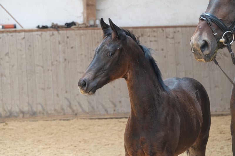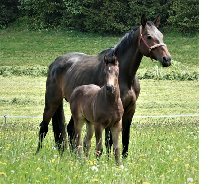 Bellissimo puledro stallone baio scuro con 4 calzini bianchi, nato a fine marzo 23 da For Romance x Desperados x Rohdiamant. È molto affettuoso e socievole con le persone. Diverse sorelle della madre hanno avuto un grande successo fino a Intermediaire I. La madre stessa, prima della riproduzione, ha vinto a 3 e 4 anni in prove di cavalli da sella e di dressage. La fattrice è in vendita anche per motivi di allevamento. È di nuovo gravida da For Romance. Video di un fratello maggiore: https://youtu.be/YlZ6QBI5hfk