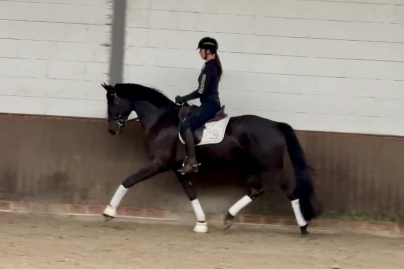 Dear prospective buyers, For questions or to schedule an appointment, please send us a WhatsApp message or an email. You can reach us by phone on weekdays, preferably around midday. If that’s not possible, simply send us a message, and we will get back to you. We look forward to hearing from you! “Micky” is a handsome stallion as you would expect – jet black, with a lush mane and tail, and of excellent quality. Under saddle, he is already very balanced and rhythmical, and his excellent basic gaits and overall presence immediately attract attention. He is very intelligent in work and has a great attitude under the rider. His mother is an elite mare who has already produced several licensed and premium stallions. Directly from the breeder, he has everything needed for a successful career in the big arena. Good health certificate available.