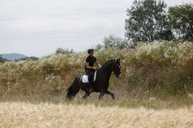 Dimaggio Fantastico è un cavallo stallone Oldenburg di circa 4,5 anni, che si distingue per la sua eccezionale maneggevolezza e tre andature fondamentali di alta qualità. Un cavallo molto moderno, espressivo e dal carattere particolarmente tipico, che cattura immediatamente l’attenzione in qualsiasi ambiente. È stato già correttamente e delicatamente avviato alla monta, in linea con la sua età, e ha familiarità con il lavoro a terra regolare. Dimaggio Fantastico viene già montato in passeggiata in campagna con la longe e si mostra altrettanto rilassato come durante le sessioni in arena. Derivato da sangue di alta scuola e da una linea di sangue con comprovata performance, Dimaggio Fantastico ha parenti famosi e di successo che ne sottolineano il potenziale: suo fratello Furore Fantastico, stallone Oldenburg approvato, ha già vinto numerose prove di dressage fino alla classe S. Anche Dimaggio Fantastico proviene dalla stessa linea di sangue sportiva, è cresciuto nel nostro allevamento e è stato avviato con cura da noi. Dimaggio Fantastico si presenta sempre in modo amichevole e semplice nel quotidiano: - affidabile al carico - bravo dal maniscalco - conosce il lavoro a terra e le uscite in passeggiata in campagna con la longe Un cavallo giovane, straordinariamente bello e vistoso, con sangue di alta scuola e proveniente da una linea di sangue di grande prestanza – ideale per cavalieri ambiziosi che cercano un partner speciale per sport e formazione.