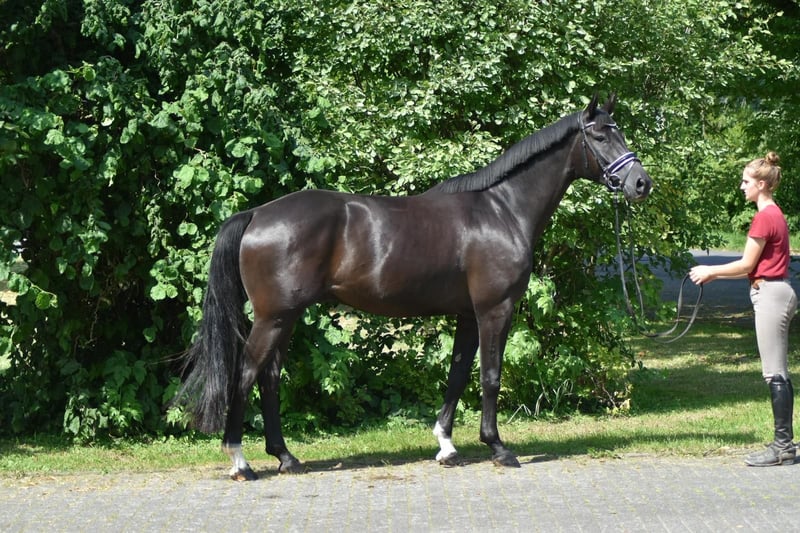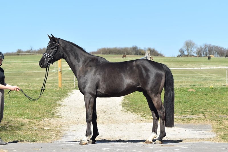 Bueno est un hongre noir né en 2021 et descendant de Best Buddy. Le hongre dispose de 3 allures très attrayantes. Dès le début de sa formation, on peut constater d'excellentes qualités d'équitation et une grande attitude au travail. C'est un jeune étalon formidable qui a tout pour devenir un partenaire sur le rectangle. Son père Best Buddy a lui-même remporté de grands succès jusqu'aux classes difficiles et marque des points sur le rectangle avec sa fiabilité, son expression et ses remarquables bonnes allures. Il a prouvé sa force nerveuse et sa polyvalence en devenant champion d'Allemagne d'attelage en 2023 et en se qualifiant pour le championnat d'Allemagne de dressage. Si vous êtes intéressés, n'hésitez pas à nous appeler. Nous sommes à votre disposition du lundi au vendredi de 08h00 à 17h00.