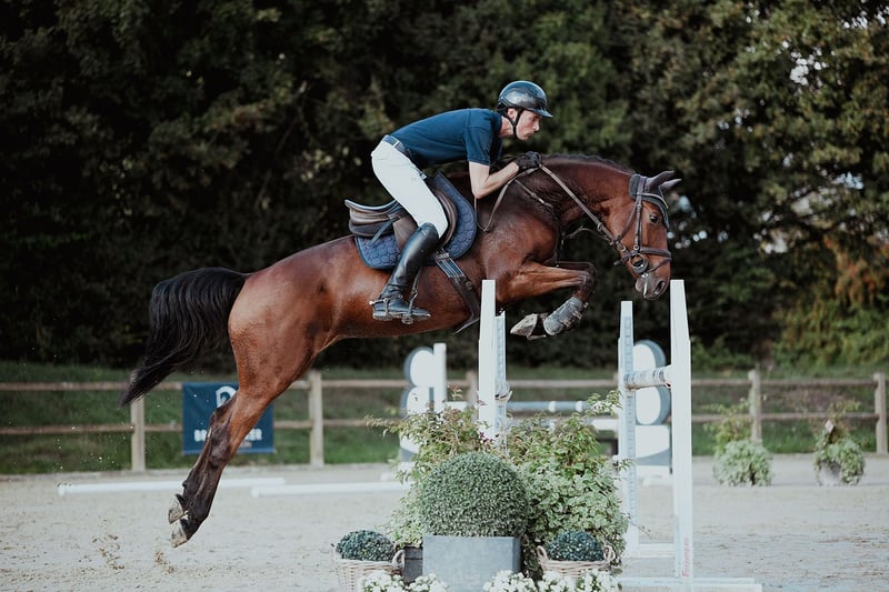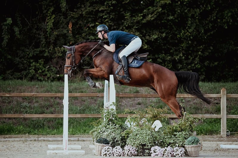 Giovane cavallo da salto con esperienza in salto e l'atteggiamento giusto.