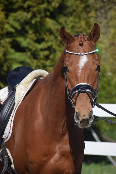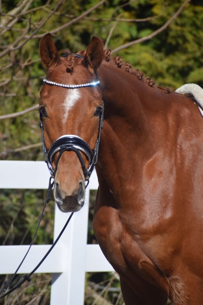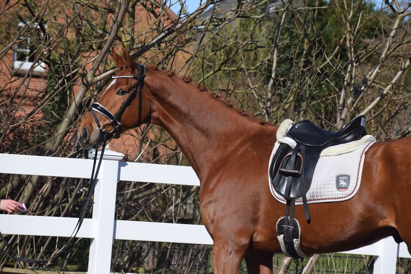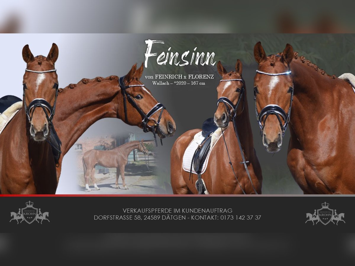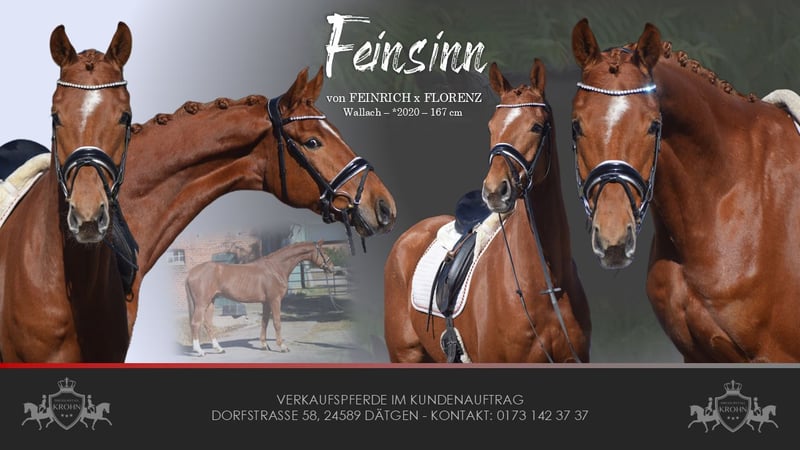 ROHDIAMANT - SEHR QUALITÄTSVOLLES NACHWUCHSPFERD - MIT VIEL GANG & OPTIK UND FEINEM CHARAKTER - OLDENBURGER ELITE REITPFERD - Für Junioren mit Jungpferdeerfahrung geeignet! Zum Verkauf steht in Vertretung des Besitzers dieses Nachwuchspferd der Extraklasse.Ein 6j., 167cm großer, oldenburger Fuchswallach, abstammend von FEINRICH x FLORENZ. Aus dem renommierten Oldenburger Egale-Stamm aus dem unzähligen hocherfolgreichen Oldenburger Auktionspferden und Grand Prix-Stars stammen. "FEINSINN" besticht mit Optik, Charakter und beeindruckenden Grundgangarten. Mit gutem Exterieur, auffällig schönem Kopf und freundlichem Charakter, zieht er alle Blicke auf sich. Setzt sich "FEINSINN" in Bewegung, wird klar, das diesem Pferd alle Möglichkeiten für den hohen Dressursport offen stehen. Bergauf-Tendenz, Schulterfreiheit, Raumgriff, Schub aus einer sehr gut gewinkelten, aktiven Hinterhand, mit schwingendem Rücken. Das sind nur einige Attribute, die man zu seiner Bewegungsqualität benennen kann. "FEINSINN" wurde Jungpferde gerecht und schonend ausgebildet und durfte auch die Sommerweide genießen. Seid dem befindet er sich im professionellen Beritt und auf Dressurpferde A-L Niveau. Das Video zeigt "FEINSINN" bei seinem ersten Ritt nach seiner Ankunft bei uns. Er kennt weder Platz, Reiter und hat sich schnell auf die neue Situation eingestellt. Bei der täglichen Arbeit bereitet er uns Freude, denn auch er hat Freude an der Arbeit, will gefallen und versucht rittig alle Hilfen umzusetzen. Jetzt ist "FEINSINN" Bereit mit seinem neuen Besitzer die Welt zu erkunden und neue Reitplätze und Hallen, sowie das Gelände kennen zu lernen und an Turnieratmisphäre gewöhnt zu werden. Der Start in Dressurpferdeprüfungen steht einem mit diesem Pferd offen. "FEINSINN´S" Charakter lässt eine dahin schmelzen. Er ist verschmust und neugierig und dem Menschen sehr zugewandt. Er ist auf dem Putzplatz tiefenentspannt und im Umgang unkompliziert. Auf der Koppel zeigt er sich sehr Sozial und unaufdringlich. Wir wünschen uns für dieses junge Nachwuchstalent, fördernde und Jungpferde erfahrene Hände. Gerne kann "FEINSINN" nach dem Kauf bei uns im professionellen Beritt verbleiben. Ein guter Tüv mit Röntgenbildern + klinischer Untersuchung liegt vor.
