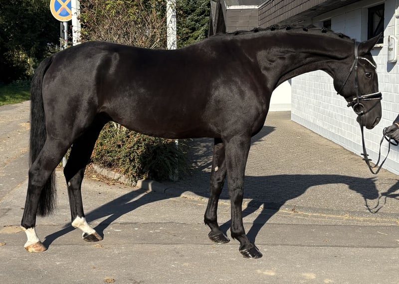 6-year-old gelding by Don Martillo x L'espoir, approximately 1.72m, for sale at a significantly reduced price due to poor vet check! He competed at 4 years old with an amateur in two riding horse classes and was able to place both times. Currently, he is in professional training and achieved 2nd place in his first start in Drpf A. Don Camino is pleasant to ride and well-behaved. He has three excellent basic gaits and a good work ethic. He is also easy to handle in the field and during handling.