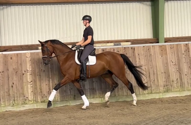 Filou is a loving gelding who is still fully in development but shows a lot of potential. Due to his size, he was started under saddle later, but he wants to do everything right and brings a lot of joy to daily work. All three basic gaits are already very solid and will certainly reach higher scoring ranges with further development. Due to a respiratory noise, this promising gelding is offered below his value.