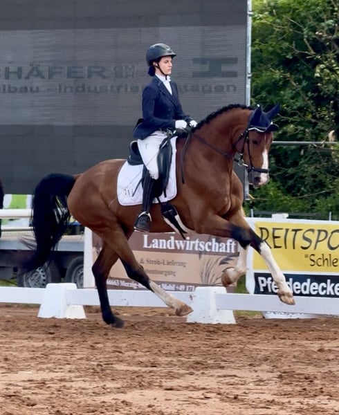 This expressive gelding by Escolar combines outstanding gaits with excellent rideability and top character traits! Thanks to his great work attitude, he brings a lot of joy to daily training and makes education easy. He has already proven his quality in competition, achieving numerous successes up to dressage horse level L. He is also a very people-oriented horse, extremely affectionate, and free of any bad habits both in handling and under saddle. Whether at competitions, during off-site training, or in the terrain, he is always reliable and well-behaved! Ideal for ambitious riders seeking a straightforward yet promising young horse with potential for the big arena. Due to his honest nature and lightness of movement, he is also suitable for less experienced or nervous riders. Upon request, all our horses can also stay with us for a transitional period with training and riding lessons. To protect our horses, we charge a trial fee of €45. More impressions can be found on our social media channels: Instagram: PREcaroPferde https://www.instagram.com/precaropferde?igsh=MThzaDBmNTNpdW1mMg%3D%3D&utm_source=qr Facebook: Carolin Nesarajah https://www.facebook.com/share/1BzEKN6QFs/?mibextid=wwXIfr For further questions or to arrange a trial ride, please feel free to contact us anytime at +49 1520 2833968.