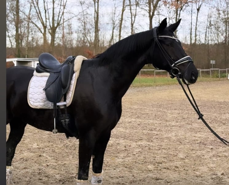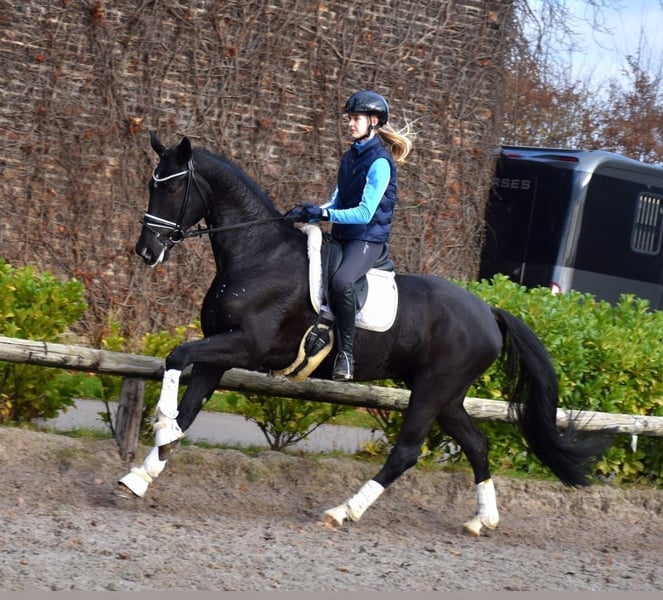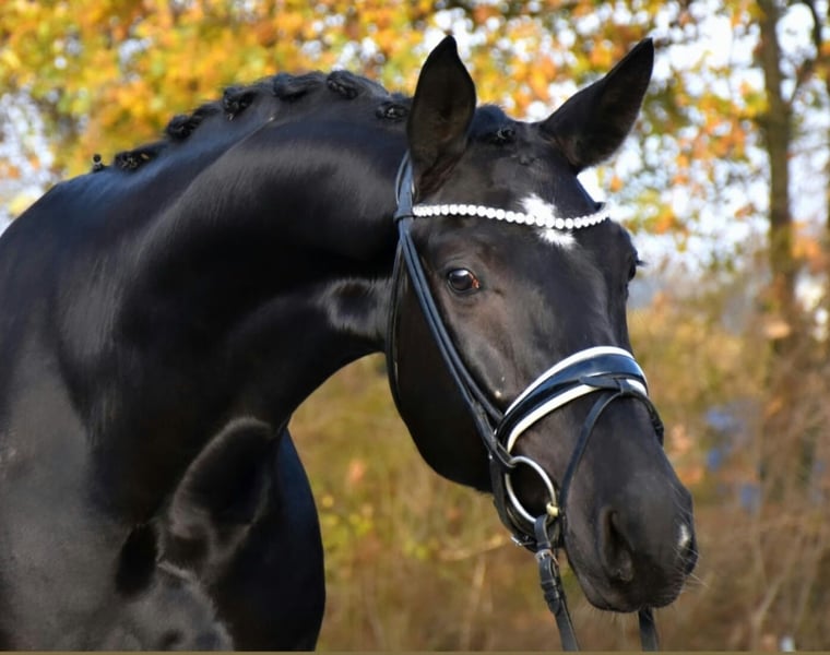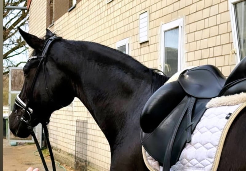 On behalf of Opportunity!!!! For someone who otherwise cannot afford a horse with this training level/quality. Beautiful 6-year-old gelding – 17.3 hh – stunning black gelding with four white markings This exceptionally typey gelding impresses not only with his noble appearance but especially with his affectionate character and three outstanding basic gaits. Training Finished with Level L dressage horses Started with Level M dressage horses Always motivated and eager to learn Gaits Walk: diligent, rhythmical, with clear overstep Trot: lively, elastic, and comfortable to sit Canter: uphill, powerful from the hindquarters, well-balanced Plenty of collection potential Interior & Behavior An absolute sweetheart: affectionate, people-oriented, and cuddly Knows terrain – both alone and in a group Loads onto our trailer without issues Farrier-friendly Spends at least 4 hours daily on the paddock, summer turnout on pasture Health Regularly vaccinated and dewormed Well-maintained care and meticulous management A large health certificate is available, including clinical and radiological examinations of the legs and back. He has mild shivering, which is why he is priced well below market value! This does not affect his riding ability. Trial riding fee is €40, which will be credited towards the purchase price.