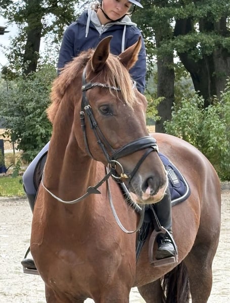 Darcey is a very well-trained and talented dressage horse who is very easy to ride. He has already won at L-Dressage level and achieved impressive results during his first competition season with his young rider. He also shows great enthusiasm and talent in jumping. He doesn’t look at jumps, approaches them well, and confidently navigates a course. In the cross-country and on the outdoor arena, he is well-behaved, reliable, and easy to handle at all times. In terms of temperament, he is very people-oriented, friendly, and straightforward. He gets along perfectly with other geldings in his group and also coexists well with mares. Darcey was licensed as an Oldenburg but was later castrated as a sport horse. Due to a minor issue that does not affect his suitability as a sport horse, he is being offered at a below-market price. We are looking for someone who can give Darcey variety and continue to develop his potential. He has a wonderful character, is farrier- and loading-friendly, and is regularly vaccinated, dewormed, and recently had a dental check. X-rays, including of the neck and poll, are available without any findings. If you are interested, please feel free to contact us at 0172-54 86 008. Videos and further information are available via WhatsApp.