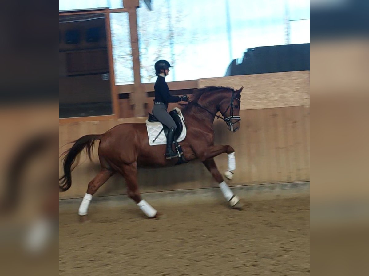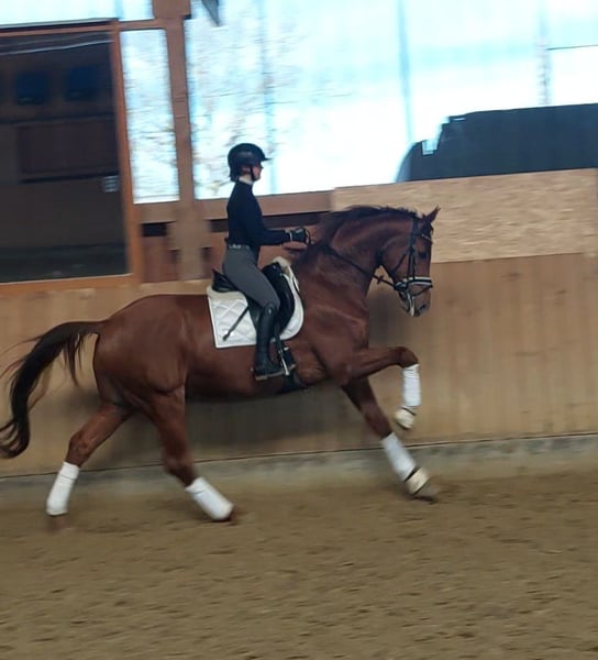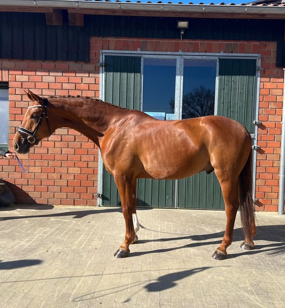 Ausdrucksstarker Dressurwallach mit Top-Abstammung – Foundation x Dimaggio x Dream of Love Zum Verkauf steht ein beeindruckender 8-jähriger Oldenburger Fuchswallach mit einer hochinteressanten Dressurabstammung: Foundation x Dimaggio x Dream of Love. Als Sohn des international erfolgreichen Dressurhengstes Foundation, der für seine kraftvollen, dynamischen Bewegungen und seine hervorragende Rittigkeit bekannt ist, bringt auch dieser Wallach beste Voraussetzungen für den Dressursport mit. Auch über seinen Muttervater Dimaggio vereint er bewährte Dressurgenetik, die für Qualität, Rittigkeit und Leistungsbereitschaft steht. Mit einem Stockmaß von 1,74 m und überdurchschnittlicher Bewegungsqualität präsentiert er sich als äußerst interessantes Pferd für ambitionierte Amateure als auch für den Profi. Er ist sehr leistungsbereit, zuverlässig und stets motiviert, seinem Reiter zu gefallen – ein Pferd mit Qualität für das große Viereck. Ferro ist sofort L-Dressur einsatzbereit. Mit den Lektionen der Klasse M wurde begonnen. Aufgrund von fehlendem Reiter jedoch aktuell nicht weiter gefördert. Jedoch bin ich mir sehr sicher, das Ferro die Lektionen mit einem versierten Reiter in kürzester Zeit problemlos erlernen wird. Ferro überzeugt durch seinen Charakter, er ein Herz aus Gold, ist sehr menschenbezogen, verschmust und ehrlich im Umgang. Gleichzeitig bringt er das nötige Go und die Arbeitsbereitschaft mit, die man sich von einem Sportpferd wünscht. Unarten, Allergien oder andere Auffälligkeiten sind nicht vorhanden. Aufgrund seiner Größe und der Tatsache, dass er ursprünglich nicht für den Verkauf vorgesehen war, wurde er erst Ende 4-jährig schonend angeritten. Er ist daher ein unverbrauchter Rohdiamant, der noch viel Entwicklungspotential mit sich bringt. Seit seinem knapp 2. Lebensjahr befindet er sich in unserem Besitz, wurde 4-jährig gelegt und ist stets sorgfältig und liebevoll aufgewachsen. Auch außerhalb der Dressur zeigt er sich als verlässlicher Partner. Auch für Ausritte und einen Ausflug in die Springstunde ist Ferro immer zu haben. Im täglichen Handling ist er absolut unkompliziert: problemlos zu verladen, brav beim Schmied, kennt den Tierarzt nur zum Impfen und Zähne machen, sozial in einer Wallachherde, vorbildliches Verhalten auf dem Turnier, macht im täglichen Umgang einfach Spaß. Ein guter TÜV inkl. Rücken und Hals aus 2020 liegt vor. Der Verkauf erfolgt ausschließlich aus gesundheitlichen Gründen meinerseits. Daher wünsche ich mir für ihn einen passenden neuen Partner, der seine Qualitäten zu schätzen weiß und ihn weiter fördert. Für weitere Informationen stehe ich gerne telefonisch oder persönlich zur Verfügung. Nach vorheriger Kontaktaufnahme (WhatsApp, Telefon o. ä.) sende ich gerne weitere Videos zu. Ein persönliches Kennenlernen sowie Probereiten ist nach vorherigem kennenlernen selbstverständlich möglich.