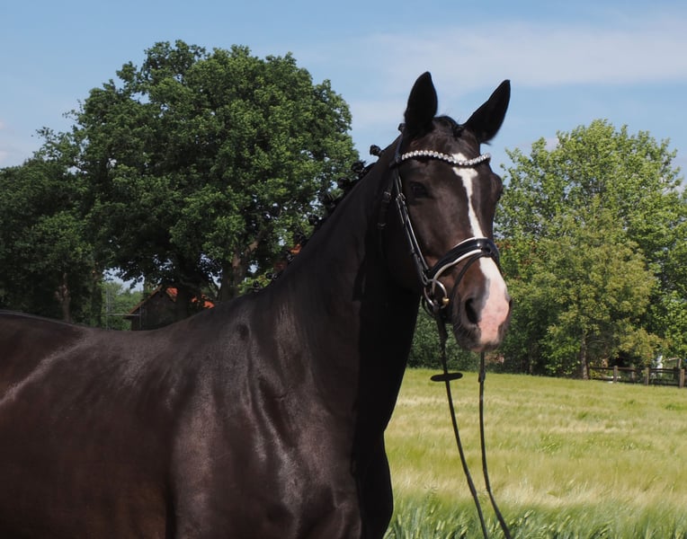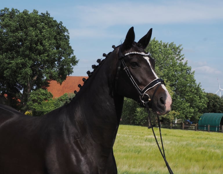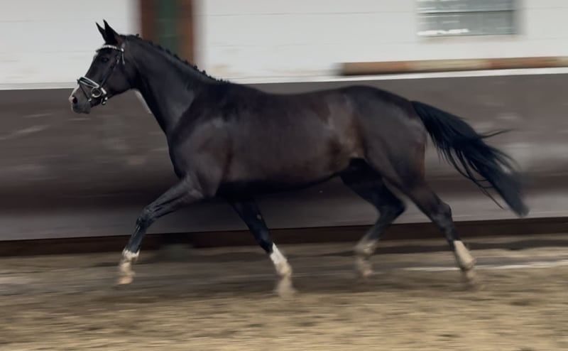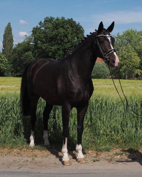 Beautiful colorful black mare with a lot of movement quality! Has already produced three prize-winning foals. In foal to the champion stallion, HLP winner and BUCha finalist "Cafe au lait"! Cafe au lait has been attracting attention for several years now with his incredibly successful offspring in dressage and show jumping at advanced level! He himself was a Bundeschampionat finalist under Philipp Weishaupt and has been successful up to advanced (S***) level in show jumping, but also has three spectacular gaits and has been trained to advanced (S) level in dressage. Stationed with Paul Schockemöhle, he has already sired a number of internationally successful show jumpers, including "Royce", victorious in the FEI CSI5* $500,000 Rolex Grand Prix Wellington. The licensed Cafe's Champus, who was bred by us, was runner-up in the Young Horse World Championships under Rene Tebbel. Also all licensed and from our breed: Cafe Junior (Cafe au lait x Silvio I), placed internationally in advanced (S*) level show jumping competitions. Cafe's Columbo (Cafe au lait x Belstaff), successful in France. Cafe`s Star (Cafe au lait x Calido I): licensed and successful in advanced (S) level show jumping in Iran. Cafe's Don Rubin (Cafe au lait x Donnerhall), successful in his first tests for young show jumpers. Other young horses out of jumping-oriented dams have already placed several times in tests for young dressage horses from novice to medium level and are remarkably strong-moving and clear-headed. The "Cafe's" are also convincing across the board in the big arena: Cafe's "Casimir" (Cafe au lait x Calido x Grannus) was the celebrated top prize winner at the Oldenburg Elite Auction, was a series winner in medium (M) level dressage horses at a young age and was a series winner again in his first advanced (S) level dressage tests as a 7-year-old! He is now victorious in international Intermediaire I classes. Kasselmann's mare Cafe's Caletta (Cafe au lait x Calato) has also already won advanced (S) level dressage and international Grand Prix. Cafe's Matts (Cafe au lait x Don Frederico) was the second most expensive dressage horse at the Oldenburg Summer Mixed Sales. All offspring are characterized by high rideability values, dream character and double disposition! Our foals receive daily mineral feed and foal starter, regular EQUISTRO Haemolytan and Ipaligo Foal, worming and a farrier are also a matter of course. The dams also receive special mare feed, juice feed, linseed oil and hay ad libitum throughout their pregnancy. This ensures that our broodmares and their offspring are always in the best of health! If the pedigree is suitable, trade-in of broodmares is also possible. There are always a few more pregnant broodmares and foals for sale, some of which can be found in the other advertisements. We produce around 25 cafe au lait foals every year. Current pictures will follow. Video requests etc. in advance only possible via WhatsApp.