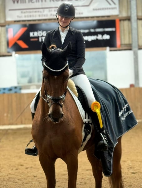 For sale is an elegant 10-year-old Oldenburg mare. Desert impresses with her appearance and three good basic gaits, making her an absolute highlight in the dressage arena. She has been trained from the start by an amateur rider and has achieved numerous placings up to level L in dressage, both on snaffle and double bridle. Most recently, she was successful and victorious in the L class last season. Videos from competitions can be gladly sent upon request. Desert always aims to please her rider, whether in training, leisure riding, or competition. She is well-behaved when it comes to the farrier, veterinarian, and loading, and has no known vices. X-rays are available. If you are looking for a cuddly partner for leisure and sport, and plan to compete in classes L and M next season, she is the perfect choice. Thanks to her impressive pedigree, she also holds potential for breeding in the future. We unfortunately have to sell Desert for personal reasons, and here, the focus is on her suitability rather than price. Please feel free to contact me by phone for further information.