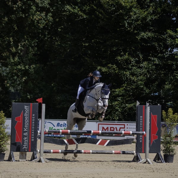 Zum Verkauf steht eine 2015 geborene Oldenburger Springstute mit einer erstklassigen Abstammung von Colestus x Contender. Die Stute besticht nicht nur durch ihre sportliche Qualität, sondern vor allem durch ihren unfassbar lieben Charakter. Sie wurde solide bis zur Klasse M ausgebildet und hat Platzierungen bis Springpferde M erreicht. In den letzten Jahren wurde sie von einem Amateur-Mädchen in der Klasse A vorgestellt, weshalb sie sich ideal als Umsteigerpferd oder für junge Nachwuchsreiter eignet. Sie ist der perfekte Partner für ambitionierte Reiter, die in den Turniersport einsteigen und gemeinsam mit ihr sportlich hoch hinaus wollen. Neben ihren sportlichen Qualitäten besticht diese Stute vor allem durch ihr unfassbar liebes Wesen und ihre nervenstarke Art. Sie ist im täglichen Umgang absolut unkompliziert, zeigt sich beim Schmied vorbildlich und lässt sich vollkommen stressfrei sowohl auf den Anhänger als auch auf den LKW verladen. Auch im Gelände ist sie eine echte Lebensversicherung: Egal ob in der Gruppe oder alleine, sie ist jederzeit regulierbar und zeigt sich von Alltagssituationen oder dem Stallalltag völlig unbeeindruckt. Unarten wie Buckeln oder Durchgehen kennt sie überhaupt nicht. Wie verlässlich sie ist, bewies sie erst im vergangenen Mai, als sie einen 10-jährigen Jungen vertrauensvoll auf sein allererstes Turnier begleitete und mit ihm souverän einen Reiter-Wettbewerb absolvierte. Sie ist ein herzlicher Partner für alle Lebenslagen, mit dem man einfach direkt losreiten und sich sicher fühlen kann. Eine ehrliche Stute mit Herz, die nun einen motivierten Reiter sucht, der mit ihr zusammen ein vertrauensvolles Team bildet.
