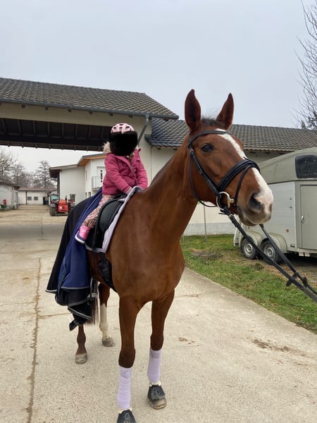 Schweren Herzens und aus privaten Gründen biete ich meine sehr liebe, 11-jährige Oldenburger Stute Sieglinde zum Verkauf an. Sieglinde ist in der Dressur bis M-Niveau ausgebildet und platziert. Die schweren Lektionen kann sie, müssen aber noch gefestigt werden. Sie springt einen kleinen A-Parcours, macht Stangenstunden und Freispringen souverän mit. Auch ins Gelände geht sie regelmäßig hat hier meist ein gutes Go. Charakterlich ist sie feinfühlig, arbeitswillig und kooperativ. Sie ist grundsätzlich brav und zuverlässig – sogar kleine Kinder konnten bereits sicher auf ihr sitzen. Gelegentlich zeigt sie sich in bestimmten Situationen sensibel oder schreckhaft. Sie bockt oder steigt jedoch nicht und ist immer händelbar. Dennoch ist sie kein Pferd für Anfänger, sondern braucht einen erfahrenen Reiter, der sie ruhig, konsequent und fördernd reitet. Insgesamt ist Sieglinde ein sensibles, lernfreudiges und verlässliches Pferd, das einem erfahrenen Reiter viel Freude bereiten wird. Sie ist gesund, geimpft und Entwurmt, geht in Hänger und ist Schmiede - und Verladefromm.