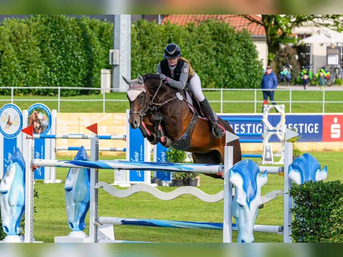 Zum Verkauf steht eine 12-jährige Oldenburger Stute mit viel Qualität und tollem Charakter. Die Stute ist ca. 1,68 m. Sie überzeugt durch ihr Sprungvermögen, ihre ansprechende Optik sowie ihre elegante Ausstrahlung. Sie ist sehr leicht zu reiten, steht fein a den Hilfen und eignet sich für den ambitionierte Reiter unter anderem im Children Bereich. In den letzten fünf Jahren wurde sie von einer jugendlichen Reiterin in der Children- und Juniorenzeit vorgestellt. In dieser Zeit konnten sie Nationenpreise gewinnen und sich auf den Deutschen Meisterschaften gut platzieren. : Die Stute ist bis zur Klasse S** (1,45 m) platziert. Aktuell wird sie auf solidem M-Niveau (bis 1,20 m) vorgestellt. Sie ist gesund, und hat Röntgenbilder ohne Befund. Weitere Infos gerne auf Anfrage.