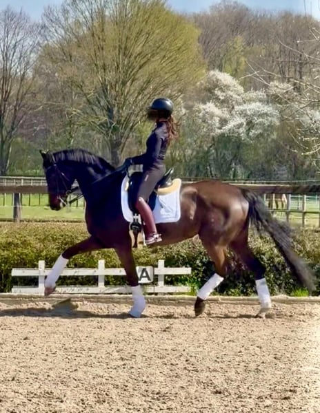 For sale is a 13-year-old, dark bay dressage mare with a height of 16.8 hh. This expressive and elegant mare has achieved up to 70% in S-level dressage tests and impresses with her consistent willingness to perform, rideability, and three very good basic gaits. She features a pleasant, rhythmical canter and an excellent work attitude—always motivated and a pleasure to ride. Her balanced temperament is especially noteworthy, both in daily training and at competitions. Calm, brave, and completely unaffected by her environment. She is ideally suited for Pony riders transitioning to bigger horses, juniors, or young riders aiming to progress to higher classes, seeking a reliable partner. In daily handling, she is very straightforward—no vices, shoe and load-in trained. She is healthy and fully in training. Private sale! Further information and videos available only after telephone contact. Please only serious inquiries.
