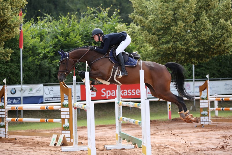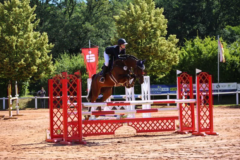 Due to a reduction in our herd, we are offering our 14-year-old mare by Balou du Rouet. She has been in our possession since she was three years old. Over the past four years, she has had foals. Since December, she has been regularly ridden and jumped again and has already competed in her first show, where she placed up to class M. Her compact size (approximately 16.1 hh), combined with easy handling, makes her very manageable. She is never strong or difficult (ridden on a water bit and by a female rider). She is not spooky in the arena, jumps water and various types of obstacles. She is shoe and loading trained, and enjoys hacking out calmly and willingly. She is very pleasant to ride because she is very soft and refined in her movements. She can be ridden by beginners as well as children. More information and videos gladly available via private message. Location: 66839 Not a desperate sale. No dealers.