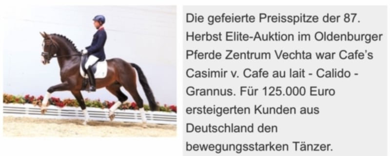¡El color y la doble predisposición están garantizados aquí! Hermosa yegua enérgica y sorprendentemente dibujada, usada para febrero de 2023 por Körsieger, ganadora de HLP y finalista de BuCha Cafe au lait, que ha estado atrayendo la atención durante varios años con su increíblemente exitosa cría en doma y salto de exhibición. Así es como Cafe's Casimir" (Cafe au lait x Calido x Grannus) fue celebrado premio en la cima de la subasta de élite de Oldenburg, ya es ganador de la serie en caballos de doma M a una edad temprana, 7 años en su primer S-doma de nuevo ganador de la serie! Ahora es victorioso en el Intermediario I internacional. Stute Kasselmanns Cafe's Caletta (Cafe au lait x Calato) también ya es S-Doma Clásica y acaba de ganar el Grand Prix internacional. Cafe's Matts (Cafe au lait x Don Frederico) se convirtió en el segundo caballo de doma más caro de las Ventas Mixtas de Verano de Oldenburg. Otros caballos jóvenes de yeguas madre saltarinas ya han sido colocados varias veces en pruebas de caballos de doma A a M y son notablemente fuertes en movimiento y despejados. No hay duda de que el Cafe au lait convence a los descendientes en el espectáculo saltando a la clase pesada. Así que el Cafe's Champus con licencia bajo René Tebbel se convirtió en vicecampeón mundial de los caballos jóvenes y también está en uso de cubierta con nosotros. También con licencia y de nuestra cría: Cafe Junior (Cafe au lait x Silvio I), salto internacional S*. Cafe au lait en sí estaba bajo Philipp Weishaupt Bundeschampionatsfinalist y ha tenido éxito hasta el salto S***, pero también ha sido equipado con tres espectaculares GGA y doma entrenada en el nivel S. Estacionado en Paul Schockemöhle, ya ha producido varios caballos de salto de exhibición de éxito internacional, incluido "Royce", victorioso en el FEI CSI5 * $ 500,000 Rolex Grand Prix Wellington. La yegua misma se ha presentado exclusivamente en salto de exhibición a pesar del descenso de doma antes de que cambiara a la cría. Tiene tres GGA muy buenos según su ascendencia, pero también fue capaz de recolectar muchas colocaciones en caballos de salto L. Nuestros potros obtienen diariamente alimentos minerales y arrancadores de potros, regularmente EQUISTRO Haemolytan e Ipaligo Foal, curas de gusanos y herrería son, por supuesto, también una cuestión de rutina. Las madres también reciben alimentos especiales para yeguas durante todo el embarazo, jugos diarios y aceite de linaza, así como heno ad libitum. ¡Así que nuestra descendencia siempre está en el mejor estado de salud! Otros potros y caballos jóvenes de nuestra propia cría bajo petición. Una pequeña parte se puede encontrar entre los otros anuncios. Con nosotros caen cada año alrededor de 20-25 foals Cafe au lait. También siempre hay algunas yeguas preñadas a la venta.