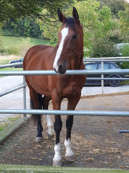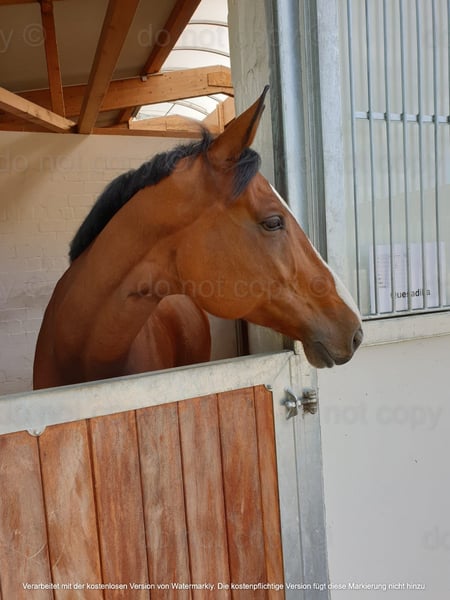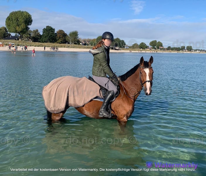 Cassie is a well-trained, charming mare seeking a new home with someone who appreciates her light-footedness and composure. She initially competed enthusiastically in dressage, show jumping, and eventing, and now proves to be a reliable partner for leisure riding. After three episodes of recurrent exertional rhabdomyolysis (RER), she remains rideable but should be exercised in moderation and warmed up carefully. A side effect is that her hind legs may become slightly swollen depending on the weather, but this has not limited her even after years. She is regularly lunged, ridden, and is familiar with groundwork such as starting work on the double longe line. She enjoys hacking out – she remains calm during rides and often acts as a lead horse for less experienced riders or other horses. Cassie is familiar with free jumping, long walks, and the lunging aid, and can bring a smile to her rider’s face with her lesson-ready attitude whether in the arena or indoor school. She jumps with enthusiasm but is no longer trained for competition courses due to her current circumstances. She has been a confident partner on adventures such as galloping along the Baltic Sea beach and crossing deep tidal pools at Neuwerk. She is shoe- and loading-safe. Currently, she enjoys several hours of turnout with a suitable pasture companion or in a small group. 24/7 pasture turnout is not suitable for her, as she prefers not to be alone on the pasture or paddock and can only tolerate insects with protective gear and for limited periods. Her musculature is supported by a low-starch and low-sugar diet. A keratitis that has occurred twice in spring due to UV exposure is managed with fly masks that provide UV protection, and a mild cataract in her left eye has so far caused no restrictions. Cassie is a classic mare who chooses her horse friends either in her box or on the pasture. In any case, she is a clever, loyal partner you can trust.