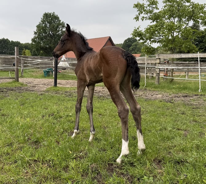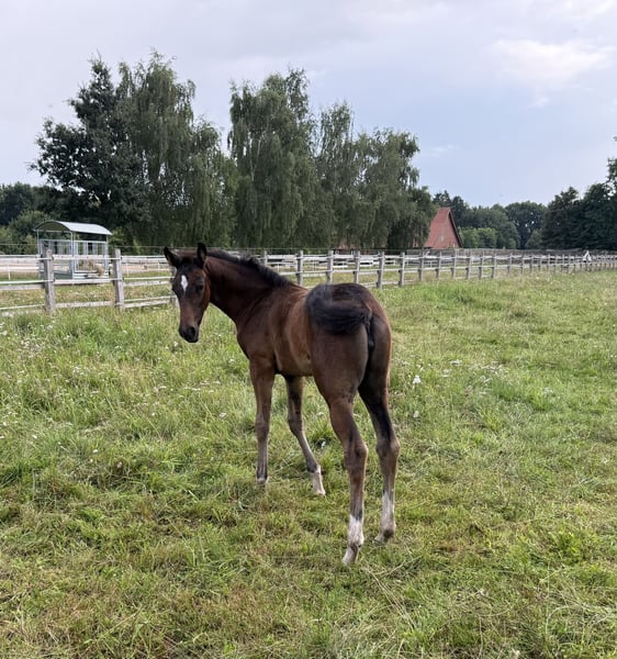Guten Tag, ( mehr geht leider nicht, ich kann es nicht verschenken)!!!!! NUR NOCH MALEN KANN MAN SCHÖNER…. zum Verkauf steht ein vielversprechendes Stutfohlen aus meiner Hobbyzucht, geboren am 23 Mai 2025. Die Mutter wurde auch selbs bei mir auf dem Hof gezogen. Die kleine Maus ist sehr mutig und zutraulich. Bei der Fütterung Stute / Fohlen kommt nur das Beste infrage. Bei Abgabe im Herbst ist die Dame Halfterführig, regelmäßig entwurmt und natürlich auch dem Schmied/Tierarzt vorgestellt. Sie eignet sich sowohl für Dressur ,Freizeitbereich als auch für spätere Zucht. Bei Interesse oder für weitere Informationen stehe ich Ihnen gerne zur Verfügung. Lassen Sie sich diese Gelegenheit nicht entgehen!