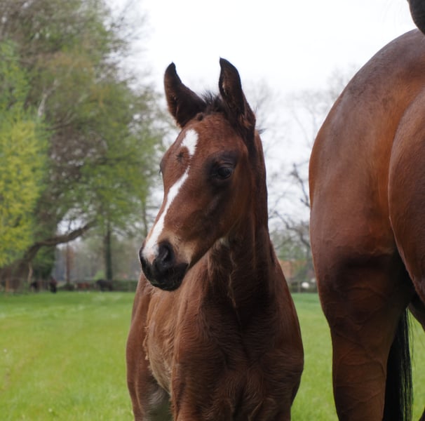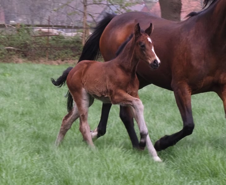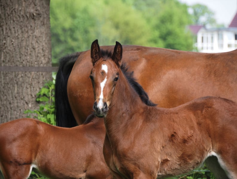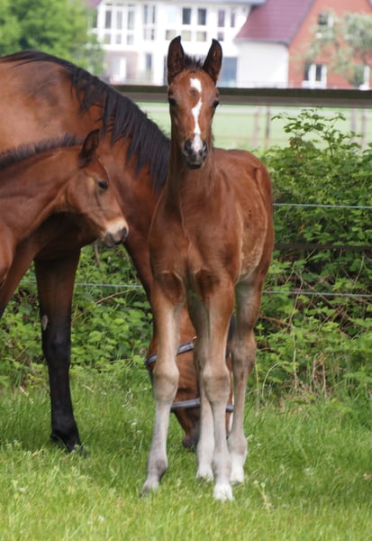 Dieses schicke und bewegungsstarke Stutfohlen stammt via Embryotransfer aus einer unheimlich ganggewaltigen Quaterback Stute, die selbst als Fohlen Preisspitze gewesen ist Durch den typisch kopfklaren und ausgeglichenen Charakter der für die Cafe au lait Linie kennzeichnend ist, wird auch dieses Nachwuchspferd für Amateure und schwächere Reiter ein toller Partner für Sport und Freizeit! Aus dem zweiten Jahrgang unseres Nachwuchshengstes "Cafe's Don Rubin", der bereits 3jährig auf seiner HLP als absolut jüngstes Pferd zu überzeugen wusste! Erst im August geboren, glänzte er trotz einem Altersrückstand von einem halben Jahr gegenüber vielen anderen 3jährigen durch seine Coolness, Leichtrittigkeit und positive Arbeitseinstellung. Im letzten Jahr 4jährig bei seinem dritten Turnier Springpferde A gewonnen und als einziger 4jähriger gegen 5 und 6jährige mit 8er Noten hoch platziert! Danach gewann er Bronze im Finale des Dobrocker Deister Springpferdechampionat in seiner ersten Springpferde-L überhaupt!! Inzwischen 5jährig Springpferde M platziert und qialifiziert zum Bundeschampionat. Parallel fungiert er trotz seines jungen Alters auch als Kinderlehrpferd für unsere 8jährige Tochter und absolviert problemlos mit 12jährigen Jungen E-Springen. Er überzeugt auf ganzer Linie durch Qualität, In- und Exterieur gleichermaßen! Begeistert täglich auf's Neue durch seine Rittigkeit, Lern- und Leistungsbereitschaft, dabei stets ausgeglichen und abgeklärt wie ein alter Hase. Auch im Gelände ein Traum! Absolut keine Hengstmanieren trotz Deckeinsatz. Unsere Fohlen bekommen täglich Mineralfutter und Fohlenstarter, regelmäßig EQUISTRO Haemolytan und Ipaligo Foal, Wurmkuren und Schmied sind natürlich ebenfalls selbstverständlich. Auch die Muttertiere bekommen die ganze Trächtigkeit hindurch spezielles Stutenfutter, täglich Saftfutter und Leinöl, sowie Heu ad libitum. So ist unsere Nachzucht stets im besten Gesundheitszustand. Weitere Fohlen und Nachwuchspferde aus eigener Zucht auf Anfrage. Es stehen auch immer wieder einige tragende Zuchtstuten zum Verkauf. Videoanfragen etc. ausschließlich vorab über WhatsApp möglich!