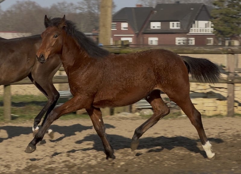 Vielversprechende Jährlingsstute aus erfolgreicher Anpaarung! Vollbruder gekört und leistungsgeprüft mit Noten bis 9,0 für Rittigkeit und Leistungsbereitschaft! So wird auch sie abstammungsgemäß klar doppelveranlagt sein und für Amateur und Profi gleichermaßen geeigent. Der Vater Cafe au lait, Siegerhengst seiner Körung, HLP Sieger und BuCha Finalist, war selbst siegreich in der schweren Klassen und hat sich in den letzten Jahren einen Namen als Doppelvererber mit Spitzennachzucht gemacht. So wurde Cafe's Casimir" (Cafe au lait x Calido x Grannus) gefeierte Preisspitze der Oldenburger Eliteauktion, ist bereits in jungen Jahren Seriensieger in S- Dressuren und international Intermediaire I siegreich. Stute Kasselmanns Cafe's Caletta (Cafe au lait x Calato) ist ebenfalls bereits S-Dressur platziert und international Grand Prix siegreich. Cafe's Matts (Cafe au lait x Don Frederico) wurde zweitteuerstes Dressurpferd der Oldenburger Summer Mixed Sales. Weitere Jungpferde aus springbetonten Mutterstuten sind bereits mehrfach in Dressurpferdeprüfungen A bis M platziert und sind bemerkenswert bewegungsstark und kopfklar. Dass die Cafe au lait Nachkommen im Springsport bis zur schweren Klasse überzeugen steht außer Frage, so zum Beispiel aus unserer Zucht: Cafe's Champus: gekört, Vizeweltmeister der jungen Pferde Cafe Junior: gekört, international erfolgreich in Saudi Arabien Cafe's Columbo: gekört und sporterfolgreich in Frankreich Cafe's Don Rubin: gekört, 4jährig als jüngstes Pferd Bronze beim Dobrocker Deisterchampionat, jetzt 5jährig mehrfach siegreich in Springpferde L, M platziert und qualifiziert zum BuCha. Cafe`s Deconi: gekört, grade 3jährig 50 Tage Leistungsprüfung mit Noten bis 9,0 abgelegt! Stationiert bei Paul Schockemöhle zeugte Cafe au lait schon etliche international erfolgreiche Springpferde, u.a. "Royce", siegreich im FEI CSI5* $500,000 Rolex Grand Prix Wellington. Cafe au lait selbst war unter Philipp Weishaupt Bundeschampionatsfinalist und ist bis S*** Springen erfolgreich gewesen, ist aber auch mit drei überdurchschnittlichen GGA ausgestattet und dressurmäßig auf S Niveau ausgebildet worden. Unsere Fohlen bekommen täglich Mineralfutter und Fohlenstarter, regelmäßig EQUISTRO Haemolytan und Ipaligo Foal. Wurmkuren und Schmied sind natürlich ebenfalls selbstverständlich. Auch die Muttertiere bekommen die ganze Trächtigkeit hindurch spezielles Stutenfutter, täglich Saftfutter und Leinöl, sowie Heu ad libitum. Daher ist unsere Nachzucht stets im besten Gesundheitszustand. Weitere Fohlen und Nachwuchspferde aus eigener Zucht auf Anfrage. Es stehen auch immer wieder einige tragende Zuchtstuten zum Verkauf. Videoanfragen etc. ausschließlich vorab über WhatsApp möglich!
