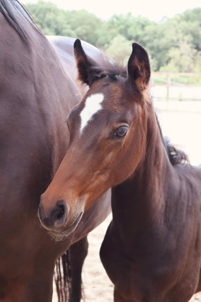Jabaluna, this modern and typy filly combines international top bloodlines with proven sport performance on the maternal side. Sire: Jasper (Heartbreaker x Darco x Ramiro Z) Jasper himself was successful internationally up to 1.60 m and participated in the Global Champions Tour, among others. With heart, caution, and ability, he influenced both his sport performances and his offspring. His pedigree is a sporting accolade: Heartbreaker – one of the most influential stallions worldwide in breeding and sport. Darco – Olympic horse and line founder, known for strength and attitude. Ramiro Z – one of the most significant breeding legends in warmblood breeding. Dam: Cadenta (Cantolar x Cardento x Zeus) The dam Cadenta was able to impress in sport herself before a pasture accident ended her career prematurely: Victories up to A-level show jumping (A**), Placings in L-level show jumping, very promising for the higher classes. Through Cardento and Zeus, the maternal line is additionally well secured. Exterior & Movement Modern, blood-typed sport model with correct foundation. Expressive, with a harmonious top line. Strong movement, especially with an elastic, uphill-carrying canter. Character People-oriented and friendly, curious in daily handling. Perspective A foal with all the qualities for international show jumping – and at the same time interesting for breeding, thanks to the double security provided by a successful dam and a top pedigree on the sire's side.