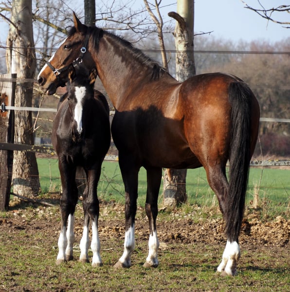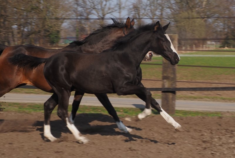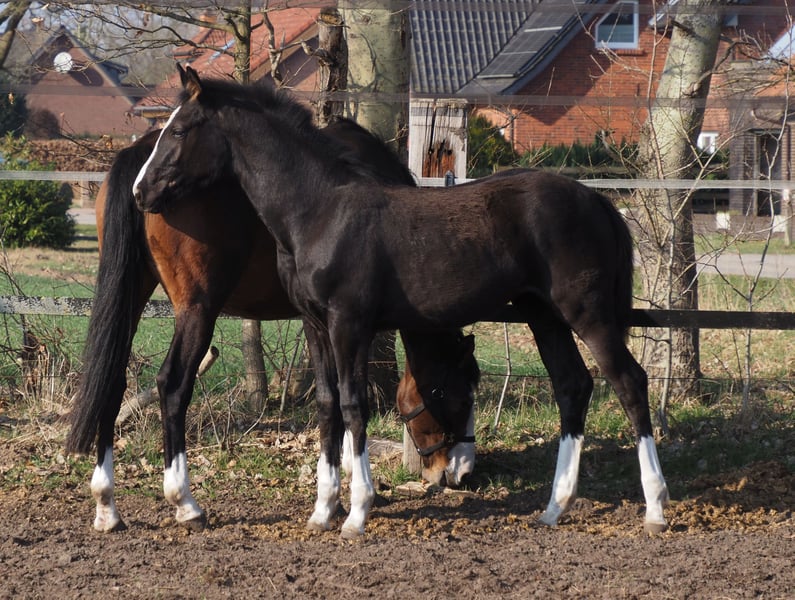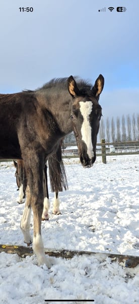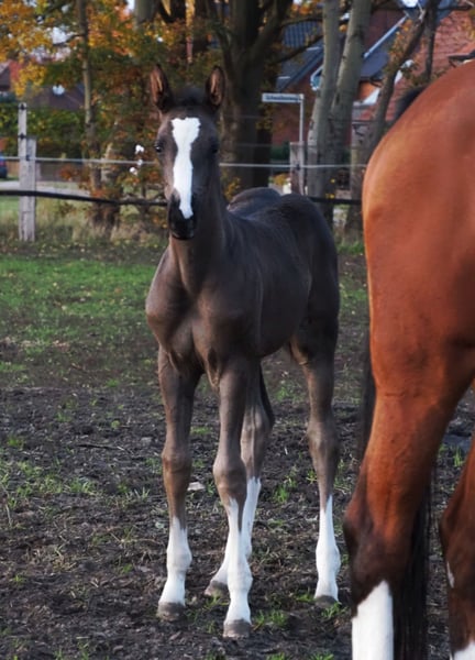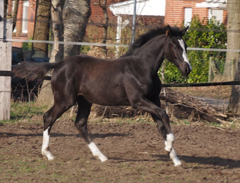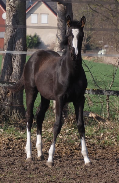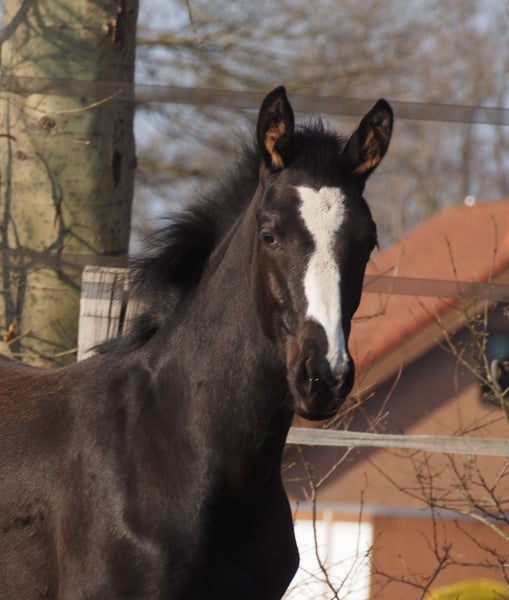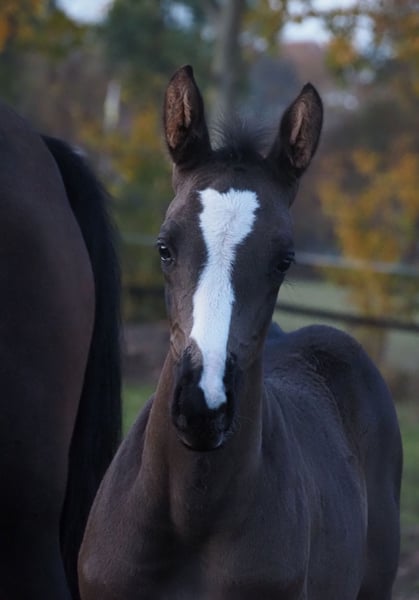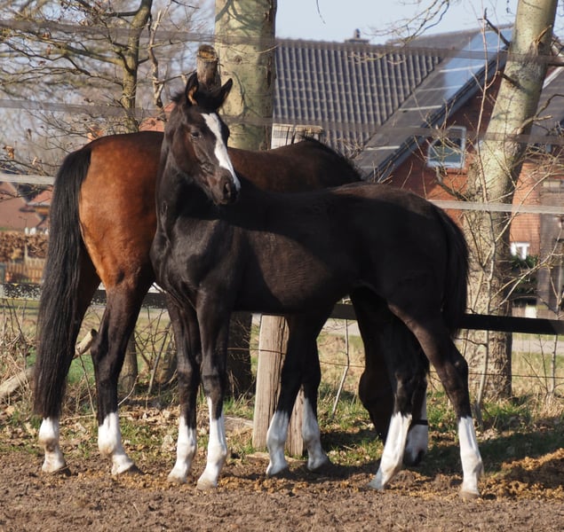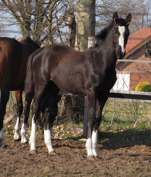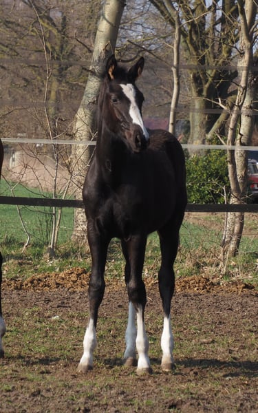 Beautifully colorful and eye-catching, this very promising black filly has an outstanding pedigree and double talent! With the typical clear-headed and balanced temperament characteristic of the Café au Lait line, this young horse will be an excellent partner for professionals, amateurs, and less experienced riders alike, whether for sport or leisure! She comes from the second crop of our young stallion "Cafe's Don Rubin," who already impressed at his licensing at just three years old, being the youngest horse in the competition! Born only in August, he stood out despite being half a year younger than many other three-year-olds, thanks to his coolness, ease of movement, and positive work attitude. Last year, at four years old, he immediately won the Spring Horse A class and was the only four-year-old placed highly against five- and six-year-olds with an 8.0 score! He then won bronze in the final of the Dobrocker Deister Spring Horse Championship in his first Spring Horse L class!! Subsequently, he also achieved multiple wins in Spring Horse L. Despite his young age, he also serves as a children's riding horse for our eight-year-old daughter and easily competes in E-jumping with twelve-year-old boys. He has now been placed in Spring Horse M and qualified for the Bundeschampionat. He impresses all around with his quality, both in movement and exterior! Daily, he amazes with his rideability, willingness to learn and perform, always calm and composed like an old hand. A dream in the terrain as well! Absolutely no stallion manners despite wearing a blanket. Our foals receive daily mineral feed and foal starter, regular EQUISTRO Haemolytan and Ipaligo Foal, deworming, and farrier visits are of course routine. The mare herd also receives special broodmare feed, daily forage and linseed oil throughout pregnancy, as well as hay ad libitum. This ensures our offspring are always in optimal health. Further foals and young horses from our own breeding are available upon request. We also occasionally have broodmares for sale, all in foal. Video inquiries, etc., are only possible via WhatsApp in advance!