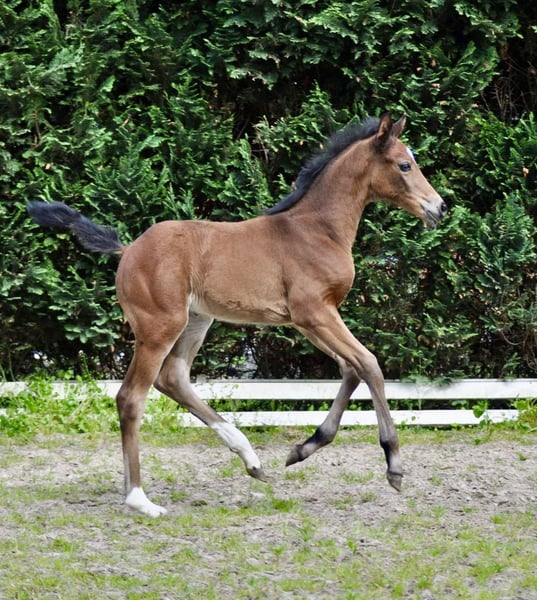 Eine Tochter des Bon Esprit, die keine Wünsche offen lässt. Gute, raumgreifende Gänge, aktives Hinterbein und ein Charakter aus Gold! Eine tolle Jährlingsstute aus kleiner liebevoller Hobbyzucht. Sie ist sehr gelehrig und im Umgang ein absoluter Schatz. Die Mutter ist Leistungsstute FN und war selbst erfolgreich bis M**.