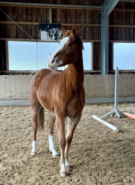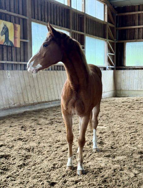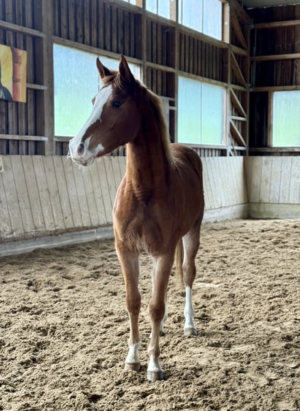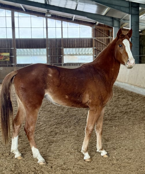 2-year-old Oldenburg chestnut mare by Ogano Sitte out of Last Man Standing, currently standing at 15.5 hh. Healthy and raised in a herd environment. Excellent movement and jumping technique. A wonderful young horse for dressage, show jumping, eventing, or leisure riding. Calm and well-behaved in handling.