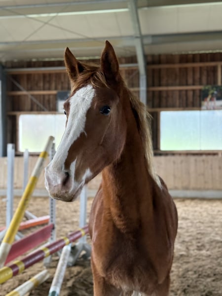 2 jähr. Oldenburger Fuchsstute v. Ogano Sitte x Last man Standing, z.Zt. Stockmaß 1.55 m Gesund und im Herdenverband aufgewachsen. Sehr Gute Bewegungen und Sprungablauf. Tolles Nachwuchspferd für Dressur, Springen, Vielseitigkeit oder Freizeit. Brav im Umgang.