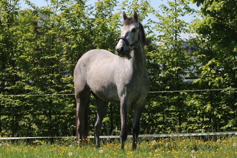 For sale: Oldenburg show jumping mare by ZINEDINE out of CASSONE, born March 2022, currently approximately 16.1 hh, grey. The mare has not yet been ridden under saddle but is already familiar with lunging with bridle and lunge line. She is well-behaved in daily handling. Viewings available by appointment. Price negotiable.