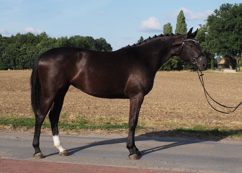 Eine weitere bildschöne bewegungsstarke 2,5jährige Tochter des Kör- und HLP-Siegers "Cafe au lait", der schon seit einigen Jahren durch seine unheimlich erfolgreiche Nachzucht im Dressur- und Springsport der schweren Klasse auf sich aufmerksam macht! Sowohl durch den Vater als auch durch die züchterisch erprobte und beidseitig veranlagte Mutter, die zudem auch über den nötigen Blutanschluss verfügt, empfiehlt sich diese elegante lackschwarze Stute für den Dressur- und Springsport, sowie den Vielseitigkeitssport gleichermaßen. Beim Freispringen überzeugt sie auf ganzer Linie durch unheimlich viel Übersicht, Vorsicht und Vermögen! Zwei ausgesprochen qualitätsvolle Vollgeschwister sind bereits verkauft und ebenfalls sehr bewegungsstark und springtalentiert! Diese schicke Stute steht im mittleren Rahmen, Stckm. zur Zeit 1,61m, Endmaß ca. 1,64m, daher das ideale Damen- und Juniorenpferd. Deckt sehr gut auch größere Reiter ab. Da sie im Dezember 22 geboren ist, zählt sie offiziell zum Jahrgang 23. Altersentsprechend wird sie zur Zeit angeritten und zeigt sich dabei absolut artig und leichtrittig. Auch von schwächeren Reitern zu händeln. Selbst im Dunkeln kann man mit ihr spazieren reiten. Cafe au lait selbst war unter Philipp Weishaupt Bundeschampionatsfinalist und ist bis S*** Springen erfolgreich gewesen, ist aber auch mit drei sehr guten GGA ausgestattet und dressurmäßig auf S Niveau ausgebildet worden. Stationiert bei Paul Schockemöhle zeugte er schon etliche international erfolgreiche Springpferde, u.a. "Royce", siegreich im FEI CSI5* $500,000 Rolex Grand Prix Wellington. Der aus unserer Zucht stammende gekörte Cafe's Champus wurde unter Rene Tebbel Vizeweltmeister der jungen Pferde. Ebenfalls alle gekört und aus unserer Zucht: Cafe Junior (Cafe au lait x Silvio I), international S*-Springen platziert. Cafe's Columbo (Cafe au lait x Belstaff), erfolgreich in Frankreich. Cafe`s Star (Cafe au lait x Calido I): gekört und S-Springen erfolgreich im Iran. Cafe's Don Rubin (Cafe au lait x Donnerhall), siegreich in seinen ersten Springpferdeprüfungen, 4jährig als jüngstes Pferd Bronze beim Dobrocker Deisterchampionat Weitere Jungpferde aus springbetonten Mutterstuten sind bereits mehrfach in Dressurpferdeprüfungen A bis M platziert und sind bemerkenswert bewegungsstark und kopfklar. Auch im großen Viereck überzeugen die "Cafe's" auf ganzer Linie: So wurde Cafe's Casimir" (Cafe au lait x Calido x Grannus) gefeierte Preisspitze der Oldenburger Eliteauktion, war bereits in jungen Jahren Seriensieger in Dressurpferde M, 7jährig in seinen ersten S- Dressuren wieder Seriensieger! Mittlerweile ist er in S** und international Intermediaire I siegreich. Stute Kasselmanns Cafe's Caletta (Cafe au lait x Calato) ist ebenfalls bereits S-Dressur und international Grand Prix siegreich. Cafe's Matts (Cafe au lait x Don Frederico) wurde Vizepreisspitze bei den Dressurpferden der Oldenburger Summer Mixed Sales. Alle Nachkommen zeichen sich durch hohe Rittigkeitswerte, Traumcharakter und Doppelveranlagung aus! Unsere Fohlen bekommen täglich Mineralfutter und Fohlenstarter, regelmäßig EQUISTRO Haemolytan und Ipaligo Foal, Wurmkuren und Schmied sind natürlich ebenfalls selbstverständlich. Auch die Muttertiere bekommen die ganze Trächtigkeit hindurch spezielles Stutenfutter, täglich Saftfutter und Leinöl, sowie Heu ad libitum. So ist unsere Nachzucht stets im besten Gesundheitszustand! Weitere Fohlen und Nachwuchspferde aus eigener Zucht auf Anfrage. Ein Teil ist unter den anderen Anzeigen zu finden. Bei uns fallen jedes Jahr um die 20 Cafe au lait Fohlen. Es stehen auch immer wieder einige tragende Zuchtstuten zum Verkauf. Cafe`s Rosemarie verfügt bereits über aktuelle sehr gute Röntgenbilder. Videoanfragen vorab ausschließlich via WhatsApp möglich.