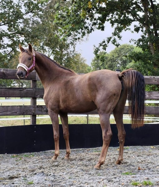 Beautiful, unbroken mare Dark chestnut Born April 20, 2023 (2.5 years old) Current height: 16.1 hh Premium foal award recipient Dynamic Dream x StPrSt Quantensprung x Caprimond x De Niro 👉 From the Caprimond dam line of Zonik Plus – winner in the Grand Prix Special at CHIO Aachen 2025🥇 Dam: Quantensprung x Caprimond x De Niro 👉 State premium mare with an overall mare performance test score of 8.4!!! Breeding evaluation 6/7. The dam was auction top at Klosterhof Medingen as a foal (€38,000). Sire: Dynamic Dream (Dream Boy – Sir Donnerhall I) Winner of the Westphalian licensing (€1.9 million) and HLP champion in Denmark. Owned by Helgstrand Dressage. Dynamic Dream is one of the most sought-after sires of his generation across Europe. His progeny includes numerous licensed sons and auction toppers like Dynamic Heart (€90,000) and Dynamic in Black (€74,500). Dam line: Oldenburg line 140 / Majorin III (by Graf – Gaudy – Gessler – Falko – Macro) – Day and Night by De Niro (Grand Prix, Bianca Ramcke) – Elite Quality Time by Quantensprung (S**, Jaya Gutheil) – Macron by Morricone I (S*, Julia Schönherr) – Quel Plaisir by Quantensprung (M**, Jens Harig, MS-Handorf 2016) – Million Dollar Baby by Millennium (M**, Jessica Nikolay) – Zacchiato by Zackerey (L, VA 2022) – OLHPrA Mirabelle by Escamillo (L) – Dodilas by Danone II (L, VA 2011) – Dauntless by Danone I (L) – Led Zeppelin by Looping (show jumping 1.40 m, Richard Kummer) – Luna by Luxius (show jumping 1.30 m, Kerstin Ilbertz) – Pik Loverboy by Pik Bube I (show jumping M, Wilhelm Brechters) Performance-tested stallions: Beniro (PB Oldenburg), Cabinett (Ldb. Moritzburg), Clever and Smart (Ldb. Zweibrücken, PB Westf.), Compagnon (PB Mecklenburg), First Promise (PB Netherlands), Friedo (PB Oldenburg), Fugato (PB Baden-Württemberg), Gordius, Inpello (PB Oldenburg, RhPfS), Lindgren, Lurioso (PB Westf.), Zico (PB Denmark, Oldenburg) International show jumpers: Atlantis 131 / Sven Schlüsselburg Cat Ballou 8 / Heinrich-Hermann Engemann Santander S / Angelica Augustsson (SWE) Farrier, dewormed, everything as it should be, sound, excellent character, human-oriented. Please feel free to contact me via private message if interested.