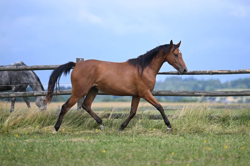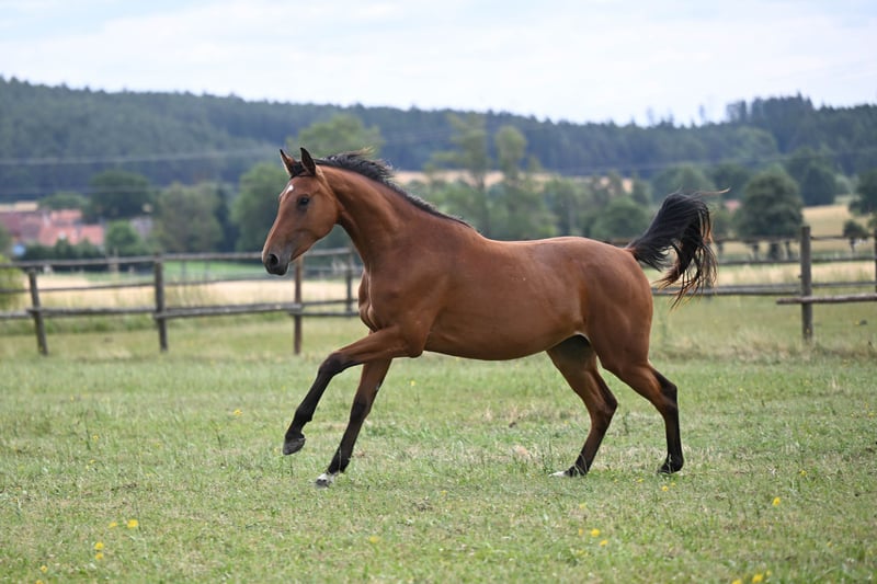 Paráda, born 2023, by Cantos (by Catoki), out of Petarda (by Lord Weingard, out of a Thoroughbred mare by Orlan × Caramel). This is a very interesting cross combining modern showjumping bloodlines with proven Thoroughbred performance lines. Parada’s dam, Petarda, competed successfully in showjumping up to 130 cm. Her granddam excelled in eventing at the CIC* level, while her great-aunt competed at CIC** level in eventing and also jumped successfully up to 130 cm in showjumping. Importantly, the Thoroughbred line includes the influential Heraldik xx, renowned for contributing exceptional athleticism, stamina, and versatility, particularly in eventing and showjumping pedigrees. This pedigree offers a rare blend of scope, endurance, and proven sport success, making Parada a very promising prospect for sport or breeding.